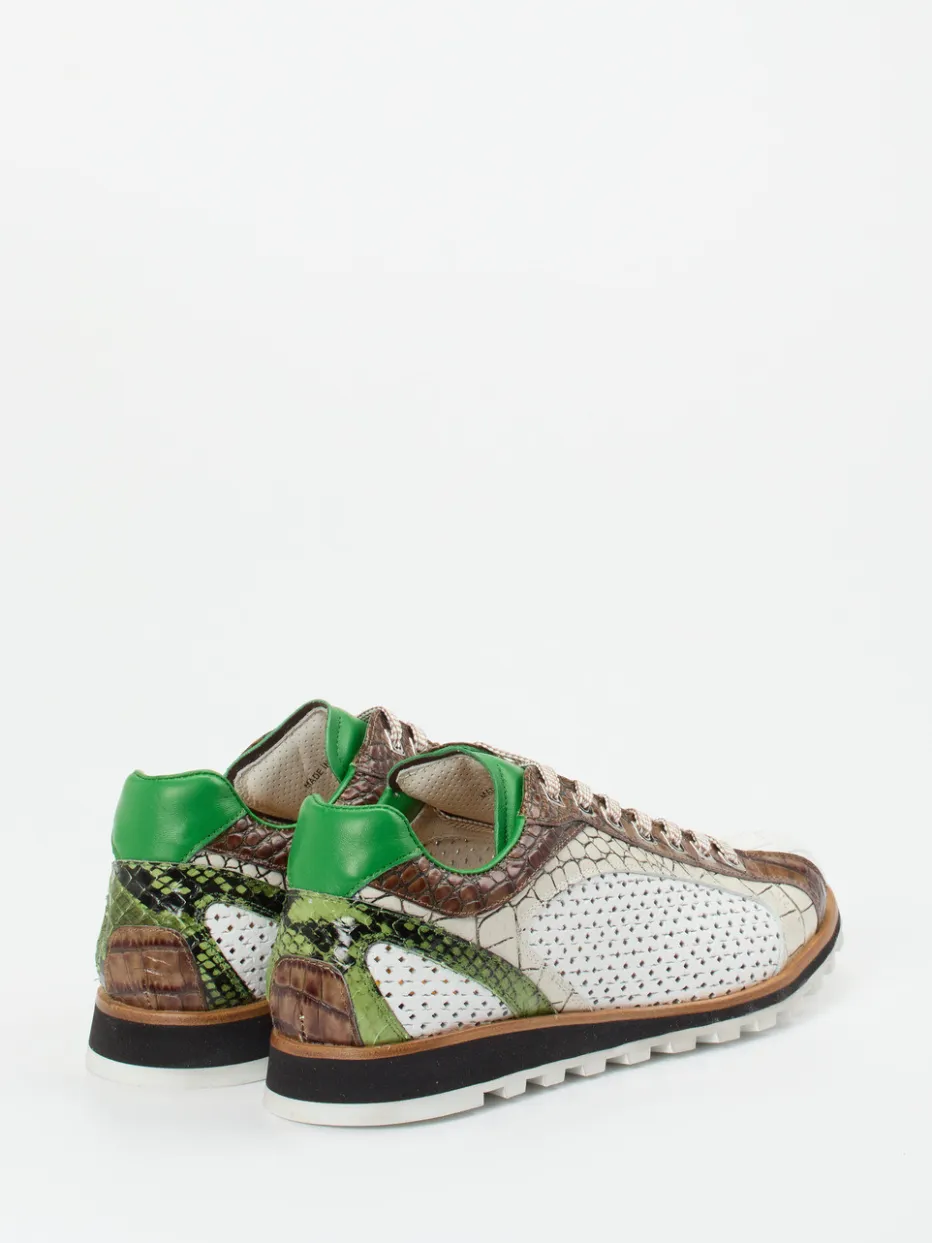 Dieser Sneaker überzeugt durch eine raffinierte Kombination aus exotischer Krokoprägung, perforiertem Mesh und frischen Farbakzenten – ideal für stilvolle Freizeit-Looks mit Charakter.