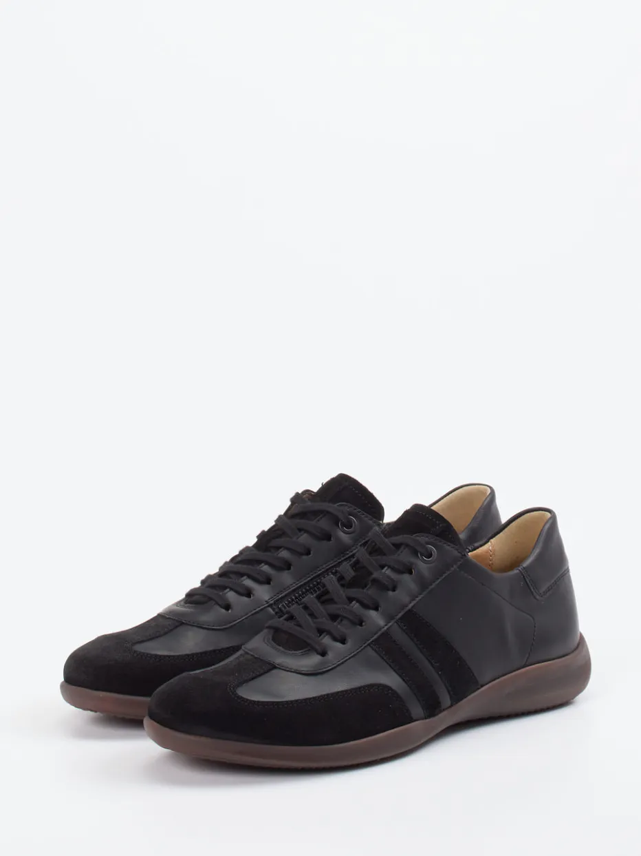 Schwarz trifft Komfort in urbaner Silhouette.Hartjes präsentiert einen Low-Top-Sneaker für Herren mit klarer Alltagstauglichkeit und elegant-sportlicher Ästhetik. Ideal für Büro und Freizeit: Der sportlich abgerundete Sneaker aus schwarzem Glatt- und samtig angeschliffenem Veloursleder überzeugt durch seine Ton-in-Ton-Panels und funktionale Details wie Schnürung plus seitlichem Reißverschluss. Die profilierte Gummisohle sorgt für sicheren Tritt, während das Innenfutter aus Leder angehnehmen Komfort bietet – auch mit Einlagen. Inspiriert von ruhiger Streetwear und Retro-Sneaker-Linien bleibt das Design stilvoll zurückhaltend. Ein vielseitiger City-Begleiter mit Leichtigkeit und dezenter Strukturwirkung typisch Hartjes.
