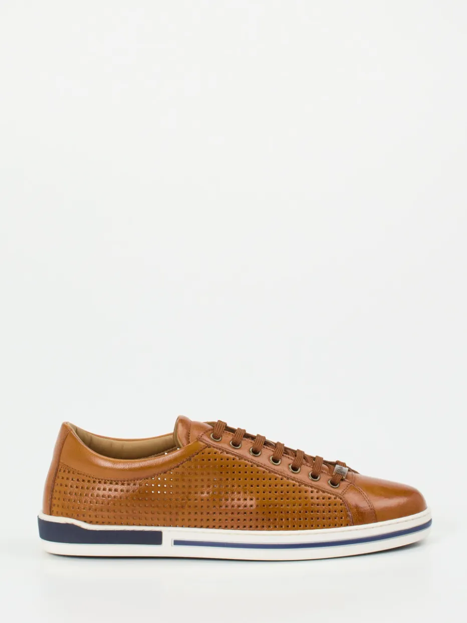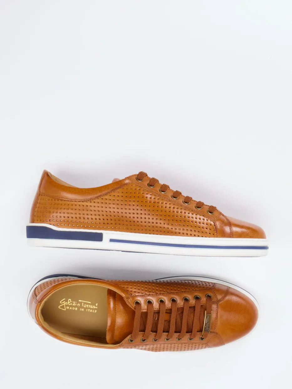 Business-Charme trifft Sommerfrische.Galizio Torresi präsentiert mit diesem Herren-Sneaker ein Modell, das stilvolle Leichtigkeit mit klassischer Linienführung vereint. Ideal für wärmere Tage im urbanen Umfeld bietet das cognacfarbene Glattleder mit samtiger Prägung und Lochmuster nicht nur edle Optik, sondern auch angenehme Atmungsaktivität. Die klassische, niedrig geschnittene Silhouette wird durch die zweifarbige Gummisohle mit marineblauem Kontraststreifen und Metall-Branding auf der Lasche akzentuiert. Lederfütterung und gepolstertes Wechselfußbett garantieren ganztägigen Tragekomfort. Minimalistisch im Gesamtbild fügt sich der Schuh perfekt in smarte Freizeit- oder Büro-Outfits ein. Ein Ledersneaker mit italienischem Anspruch an Stil und Qualität.