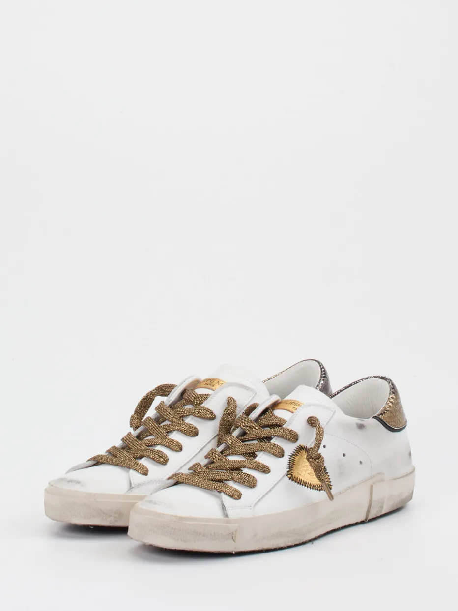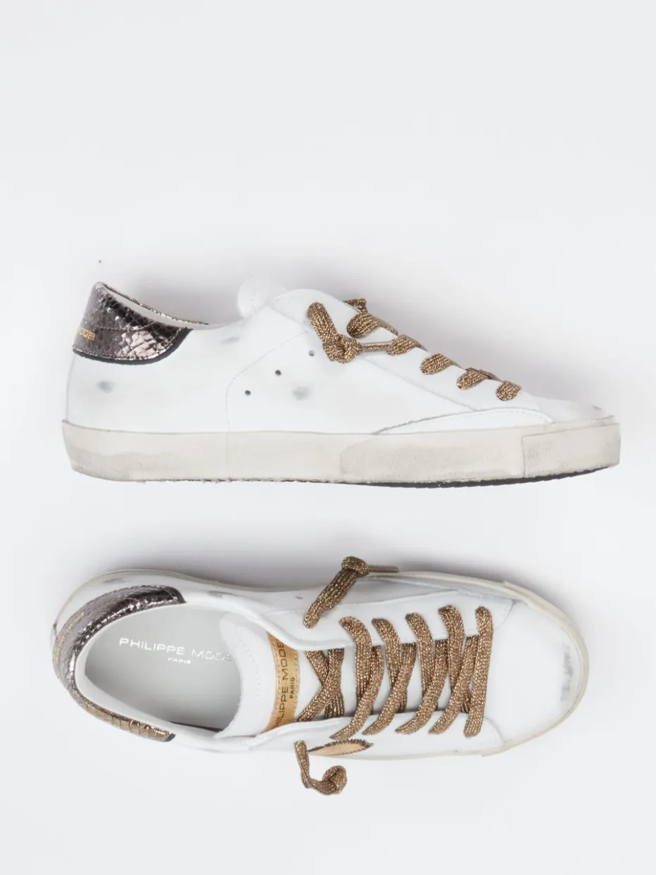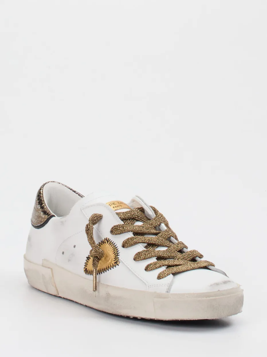 Goldakzente mit urbanem Anspruch.Philippe Model interpretiert den klassischen Low-Top-Sneaker neu. Stilsicher durch die City: Dieses Modell aus weißem Glattleder kombiniert eine moderne Used-Optik mit goldfarbenen Schnürsenkeln und einem Reptilstruktur-Fersenpatch. Die matt gehaltene Oberfläche und das flache Profil verleihen dem Design seine streetwear-inspirierte Lässigkeit. Eine flexible Gummisohle sorgt für angenehme Trittdämpfung im Alltag, das atmungsaktive Frotteefutter ergänzt den Komfort durch praktischen Nutzen. Streetstyle trifft auf ausdrucksstarke Details – perfekt zu oversized Shirts und goldigen Accessoires. Authentischer Look mit italienischer Design-Eleganz.