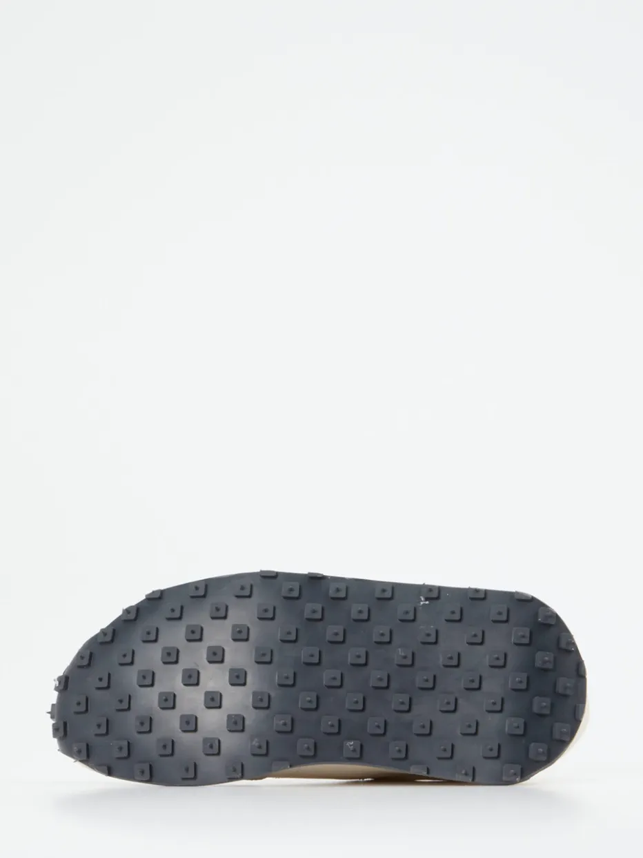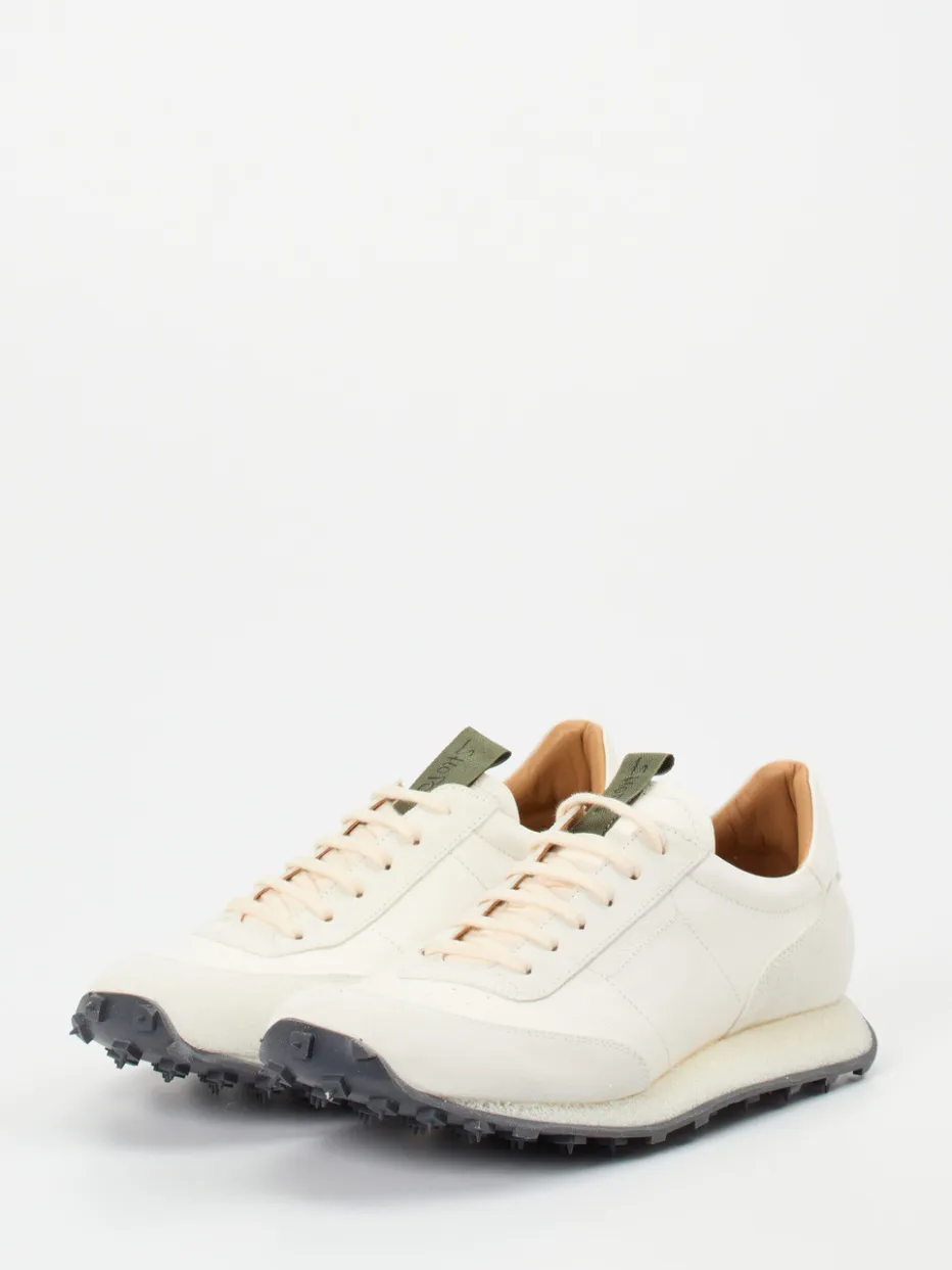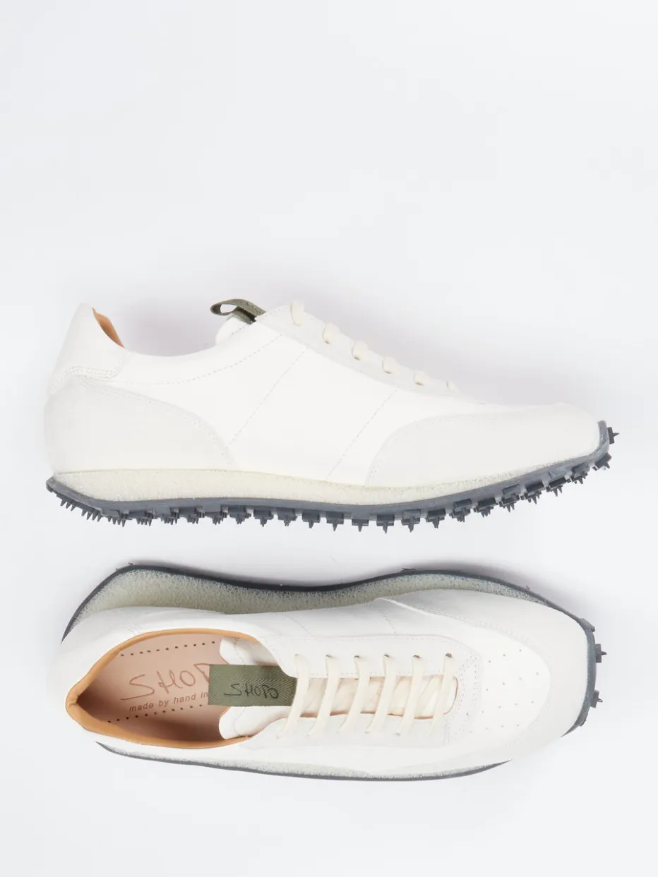 Retro-Vibes für moderne City-Looks.Dieser Sneaker von Shoto gehört zur Kategorie Retro Runner und vereint minimalistisches Design mit luxuriöser Verarbeitung. Perfekt geeignet für entspannte Spaziergänge durch die Stadt oder stilvolle Reisen, überzeugt das Modell mit einem Mix aus weißem Känguruleder mit feiner Narbung und Veloursleder-Details in Hellgrau. Akzente setzt eine olivgrüne Textil-Zugschlaufe, während die flache, profilierte Gummisohle mit cremiger Schwammstruktur sicheren Halt bietet. Die sportlich inspirierte Form mit prägnanter Nahtführung greift aktuelle Retro-Trends wie Quiet Luxury auf und bleibt dabei harmonisch kombinierbar – etwa mit Raw-Denim oder Overshirt. Handgefertigte Eleganz trifft auf komfortable Vielseitigkeit.