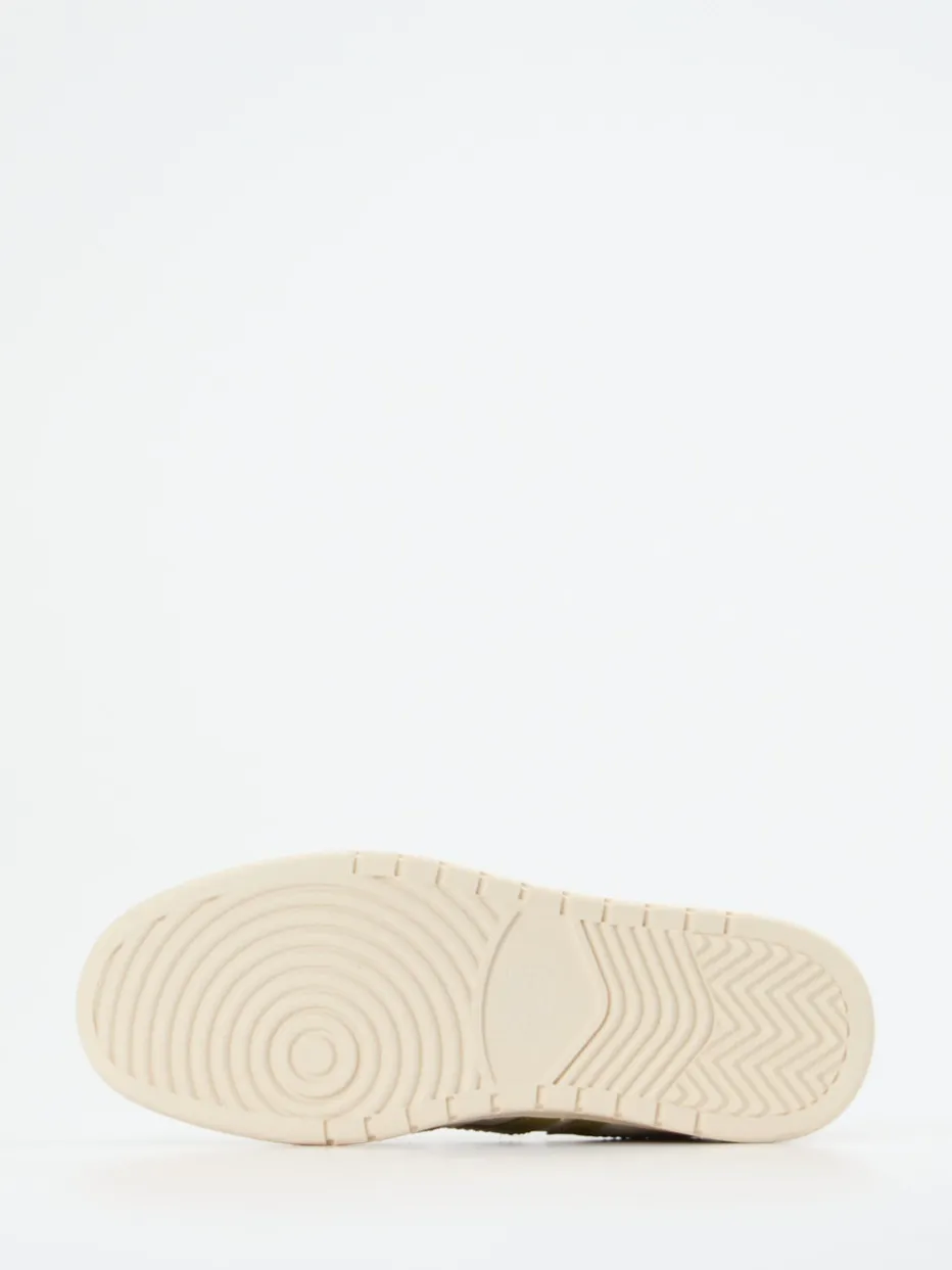 Ideal für entspannte Stadttage sorgt der Materialmix aus weißem Kalbleder und samtig angeschliffenem Veloursleder in Sand für Struktur und Tiefe. Farbige Akzente in Gelb, Olivgrün und Rot sowie die gezackte Seitenapplikation setzen ein konsequent stylisches Statement. Der gepolsterte Schaftrand, das mit Kalbleder ausgekleidete Innenfutter und das auswechselbare Fußbett sorgen für spürbaren Komfort. Die flexible Gummisohle unterstreicht die Alltagstauglichkeit – perfekt für den Color-Blocking-Trend der kommenden Saison.