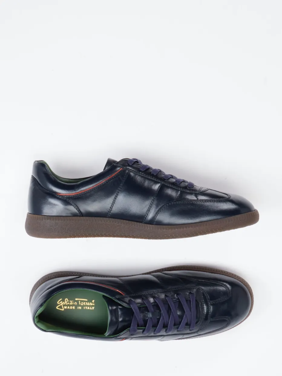 Italienisches Design mit Retro-Charme.Galizio Torresi interpretiert den klassischen Herren-Sneaker neu – mit hochwertigen Materialien und stilvollem Understatement. Ideal für entspannte Tage in der Stadt überzeugt dieses Modell mit dunkelblauem Kalbleder, das samtig glänzt und butterweich in der Haptik ist. Rote Paspelierungen und ein grünes Innenfutter setzen ebenso dezente wie markante Farbakzente. Die sportliche Silhouette mit flacher Schnürung und profilierter Gummisohle unterstreicht den Vintage-Charakter mit moderner Streetwear-Attitüde. Perfekt zu lässigem Denim oder Chino. Ein entspannter Premium-Look für stilvolle Auftritte mit Komfortanspruch.