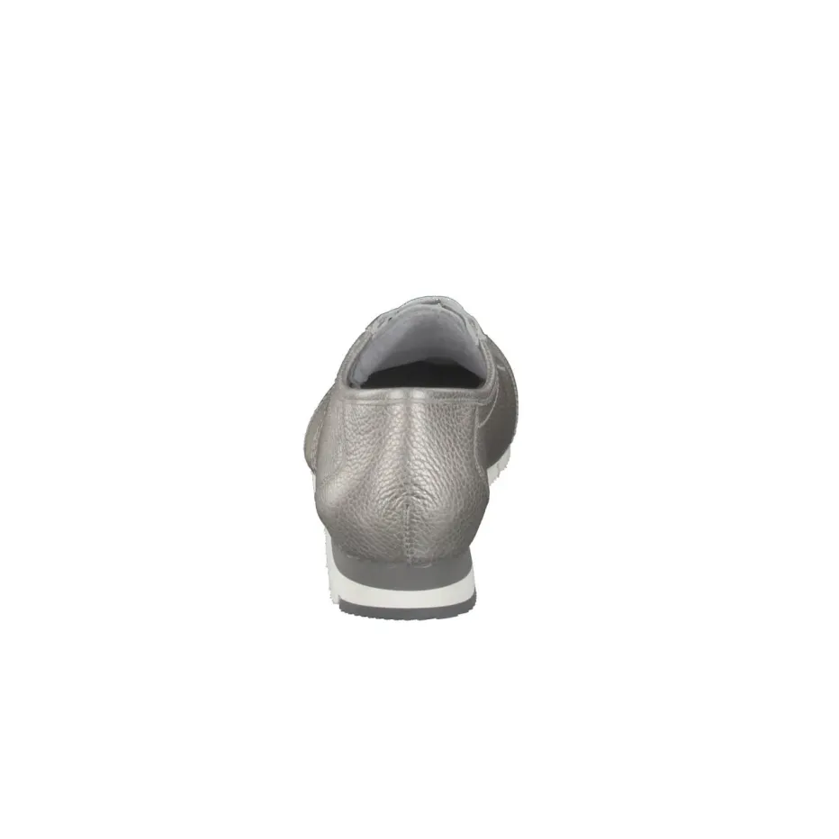 Ideal für einen aktiven Büroalltag oder entspannte City-Walks bietet das Modell aus silberfarbenem, metallisch glänzendem Kalbleder mit genarbter Oberfläche und flacher, schmaler Silhouette eine stilvolle Lösung. Die profilierte Luftpolstersohle in Weiß und Dunkelgrau sorgt für Stabilität und Komfort, das Innenfutter aus Leder und das herausnehmbare Fußbett bieten zusätzlichen Mehrwert. Filigrane Details wie silberfarbene Öse und Seitenemblem verleihen dem minimalistischen Design Tiefe. Trendig durch Metallic-Highlights – passend zu hellen Jeans oder eleganten Hosen.