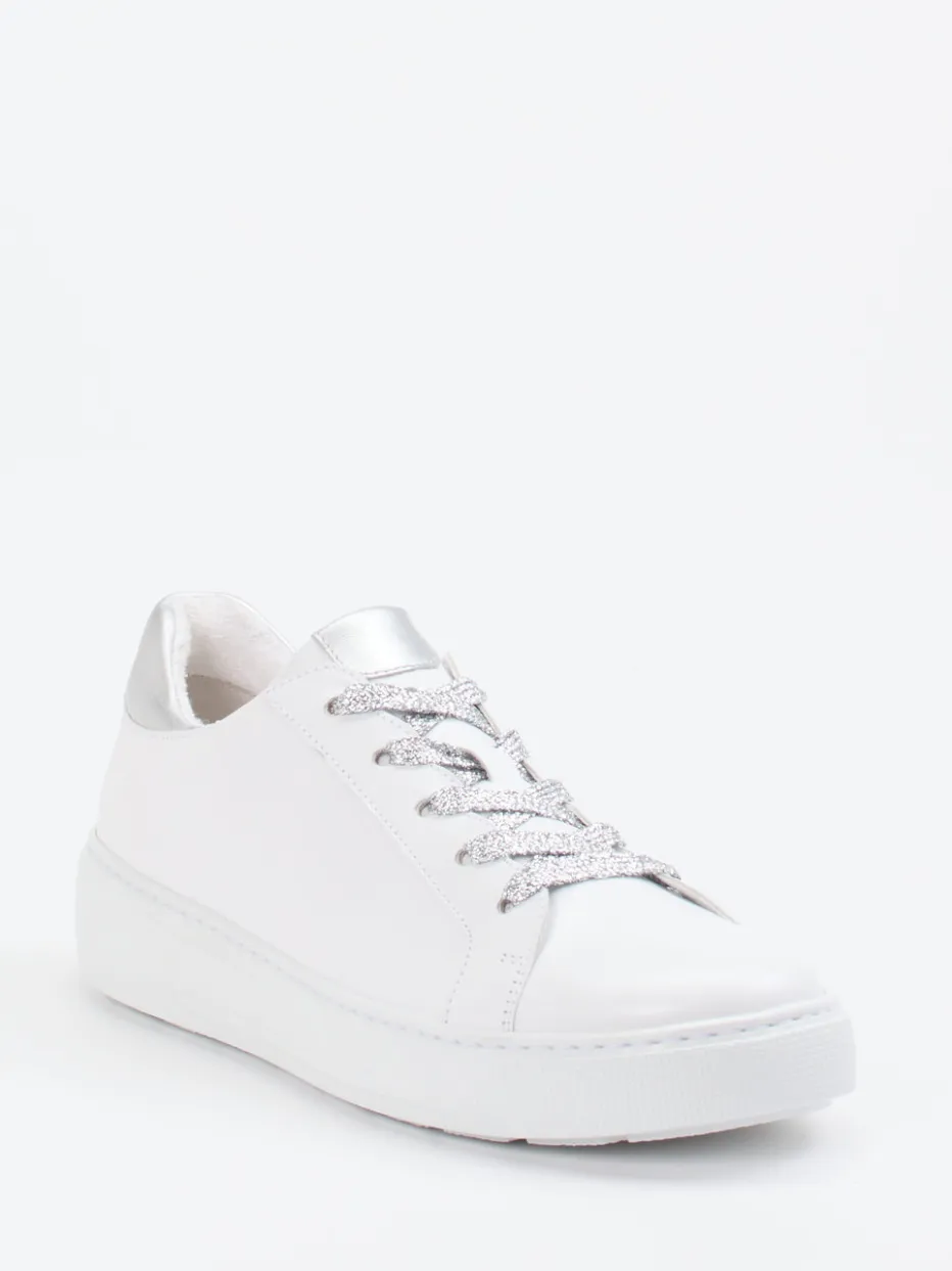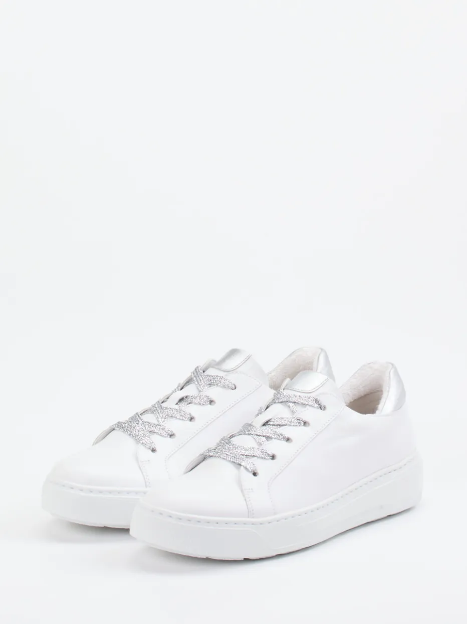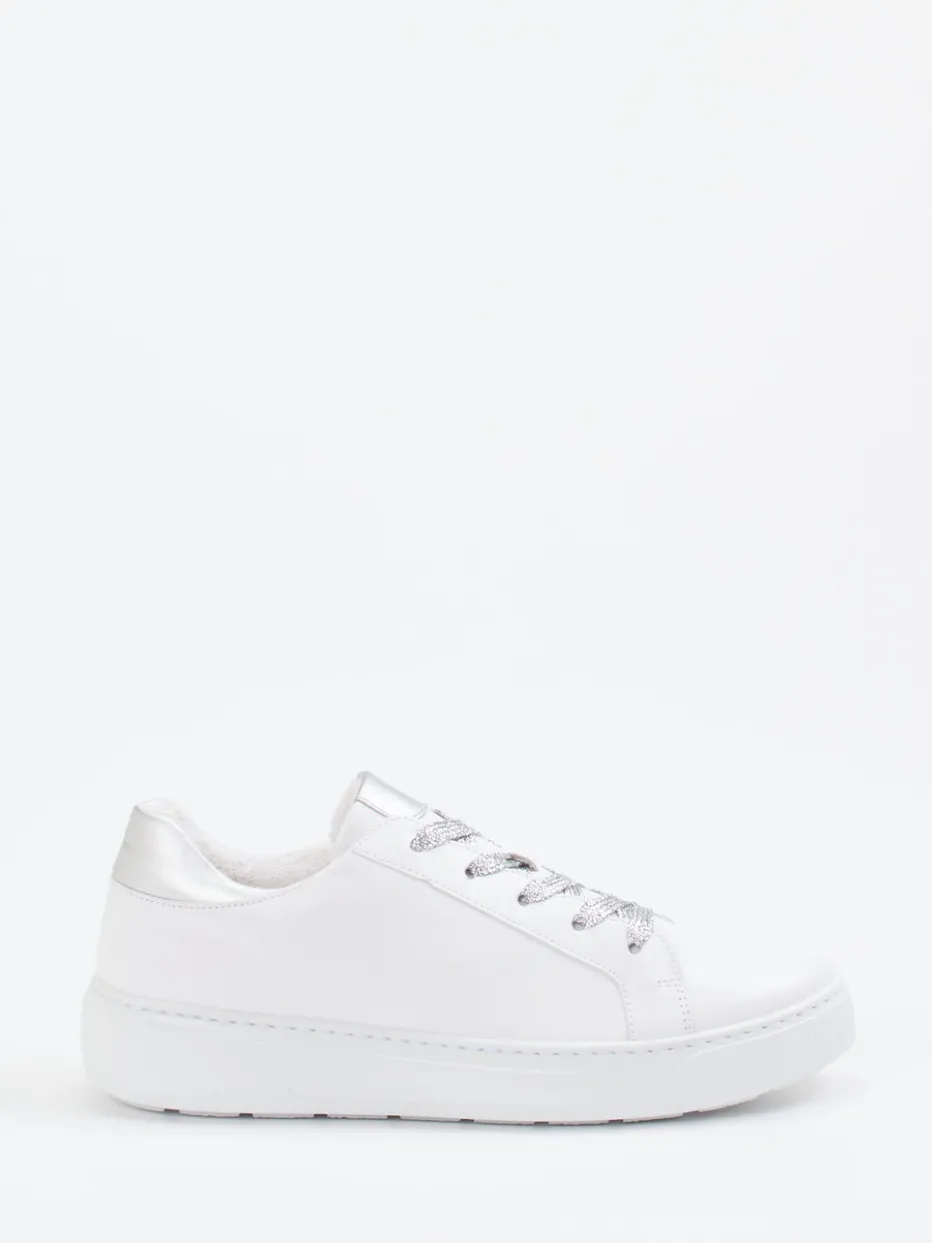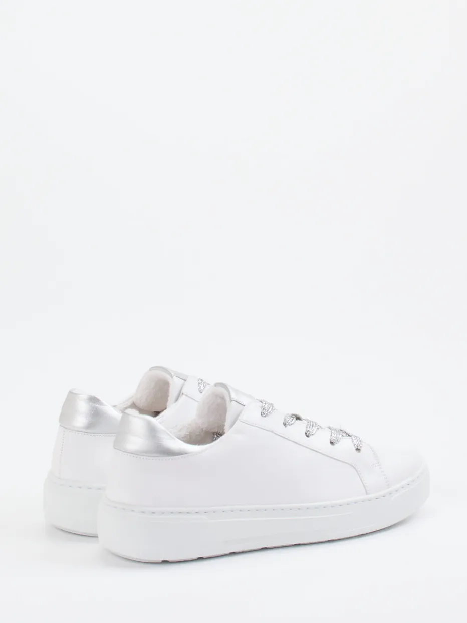 Für entspannte Alltagsmomente mit modischem Anspruch: Das hochwertige Kalbleder kombiniert mit einer mattweißen Oberfläche trifft auf irisierende Glitzerschnürsenkel und eine metallic-silberne Fersenkappe – ein subtiler Eyecatcher. Der gepolsterte Schaftrand und das weiche Innenfutter bieten angenehmen Tragekomfort. Die profilierte Gummisohle sorgt für Rutschfestigkeit, während das herausnehmbare, lederbezogene Fußbett Funktionalität garantiert. Streetwear und Minimalismus fließen hier trendbewusst zusammen. Lässt sich ideal zu weißen Jeans oder silbernen Accessoires stylen.
