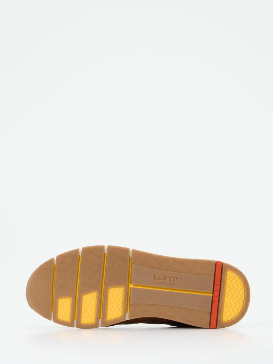 Performance trifft Stil.Lloyd präsentiert einen Herren-Sneaker, der durch seine klassische Formsprache und hochwertige Verarbeitung überzeugt. Ideal für stilvolle Freizeittage oder den modernen Business-Casual-Look: Gefertigt aus glattem, leicht glänzendem Kalbleder in elegantem Cognacbraun, unterstreicht perforiertes Seitenleder subtil den Retro-Charme. Die helle Gummisohle mit gelben Akzenten bietet zuverlässige Dämpfung und eine sportive Note. Dank gepolstertem Schaftrand und herausnehmbarem Fußbett zeigt sich der Sneaker besonders komfortabel. Der Look entspricht der ruhigen Eleganz des Quiet-Luxury-Trends und passt zu Denim wie zu Chino. Lloyd steht für zeitlose Herrenmode mit durchdachter Passform und stilvoller Alltagstauglichkeit.