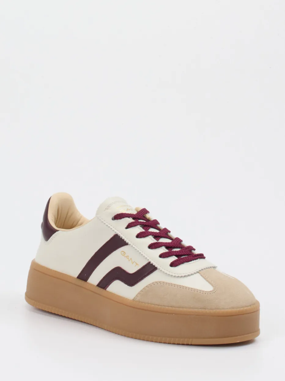 Retro-Stil mit modernen Akzenten.Gant präsentiert einen lässig-eleganten Sneaker für Freizeit und Urlaub. Die Kombination aus cremeweißem Kalbleder und samtigem Veloursleder in Beigebraun verleiht dem Schuh seinen edel-sportlichen Charakter. Akzente in Bordeauxrot und das goldfarbene Branding setzen stilvolle Kontraste. Die klassische, ovale Silhouette wird durch eine profilierte Gummisohle ergänzt, die guten Halt bietet. Der Schuh überzeugt mit Retro-Charme und minimalistischer Klarheit – inspiriert vom aktuellen Retro-Revival-Trend. Vielseitig kombinierbar mit Casual Shorts oder leichten Sommerkleidern. Das sportlich-zeitlose Design bringt Gant-Stil souverän in den Alltag.