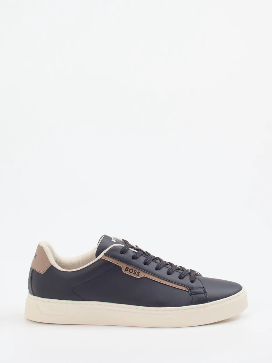 Stilvolle Zurückhaltung für jeden Tag.Der Herren-Sneaker von Boss verbindet lässige Eleganz mit klarer Linienführung. Ideal für urbane Alltagssettings oder reduzierte Business-Casual-Outfits setzt dieser Sneaker auf mattes Kalbleder in Dunkelblau, kombiniert mit taupefarbenen und beigen Akzenten. Die kontrastierende Ferse und das subtile Markenbranding auf Zunge, Seite, Ferse und Sohle unterstreichen den minimalistischen Look. Die strukturierte Gummisohle mit hellcremer Note sowie das gepolsterte Innenfutter sorgen für Komfort und Modernität. Ein hochwertiger Begleiter, der für dezente Markenaffinität und gepflegte Vielseitigkeit steht.