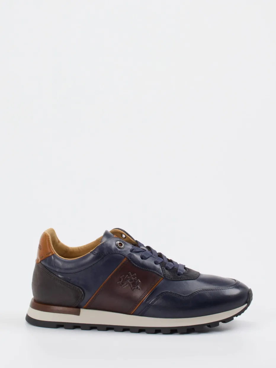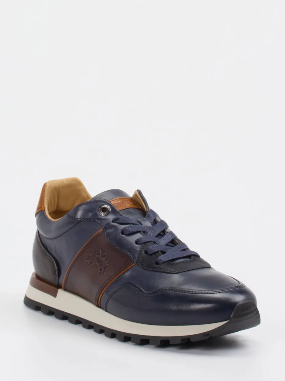Ideal für stilvolle Freizeitmomente: Der Sneaker verbindet fein glänzendes Kalbleder mit samtigem Veloursleder zu einem eleganten Materialmix. Die dominante dunkelblaue Farbgebung erhält durch cognac- und kastanienbraune Akzente kontrastreiche Tiefe. Details wie die dezente Logoprägung, eine sportiv geschwungene Silhouette und die griffige Gummiprofilsohle erfüllen Ansprüche an Komfort und Stil gleichermaßen. Inspiriert vom italienischen Casual Chic und dem aktuellen Heritage-Trend ergänzt er moderne Looks von Chino bis Denim.