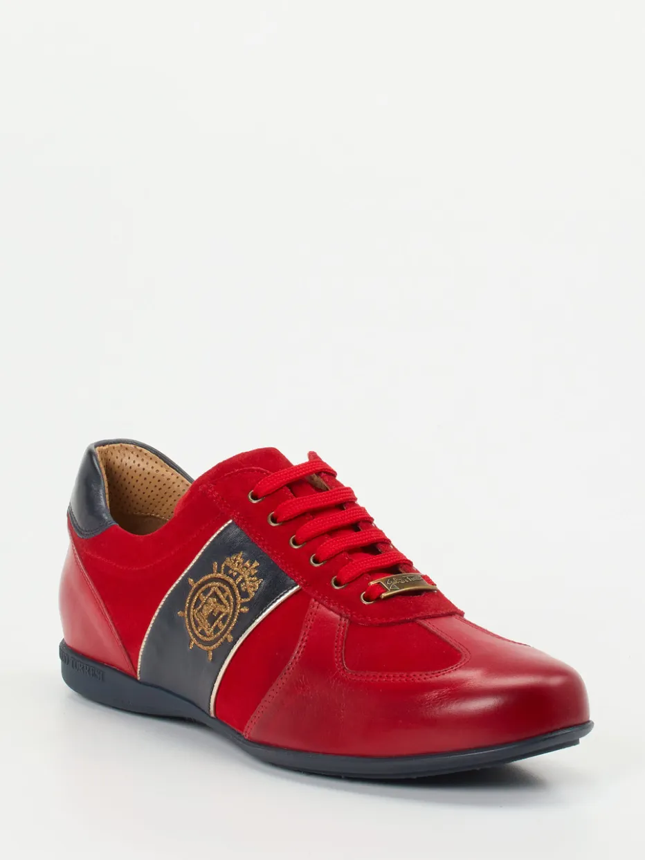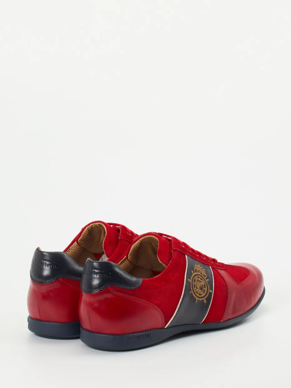 Stilbewusst unterwegs – mit italienischer Raffinesse.Galizio Torresi präsentiert einen Herren-Sneaker, der mutiges Design mit edler Materialwahl verbindet. Für markante Auftritte in Freizeit oder Bar-Abend sorgt die auffällige Farbkombination aus kräftigem Rot mit dunkelblauen Details. Das Zusammenspiel von Kalbleder in glatt schimmernder und velourartiger Textur unterstreicht den luxuriösen Charakter. Akzente in Gold, etwa die Zierplakette auf der Lasche und die seitliche Stickerei, verleihen dem sportlich-geschliffenen Low-Top mit schmal zulaufender Silhouette einen exklusiven Look. Die gepolsterte Innensohle ist herausnehmbar – Komfort auf modernem Niveau. Besonders wirkungsvoll zu dunkelblauen Chinos oder Statement-Jacke. Galizio Torresi vereint italienische Formsprache mit handwerklicher Wertigkeit.