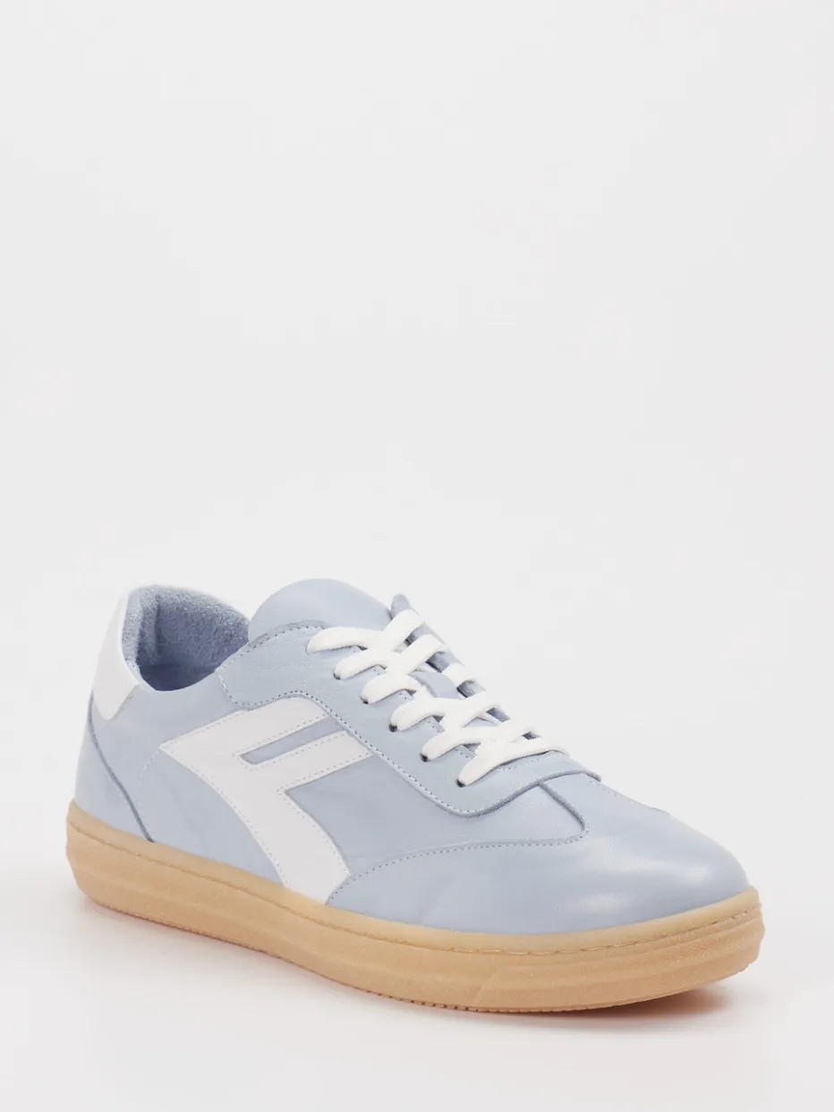Frischer Pastellakzent für urbane Styles. Andrea Conti präsentiert mit diesem Sneaker ein sportlich-legères Unisex-Modell für Alltag und Freizeit. Gefertigt aus hochwertigem Kalbleder, kombiniert dieser Low-Top Sneaker eine glatte, leicht glänzende Oberfläche mit einem modernen Hellblau. Eine klassische, flache Silhouette wird ergänzt durch weiße Kontrast-Overlays, ein seitliches Logo und eine naturfarbene Gummisohle mit strukturierter Profilierung. Innen überzeugt weiches Lederfutter mit Tragekomfort und Einlagenfreundlichkeit. Die klare Formensprache greift den Retro-Trend auf und passt ideal zu athletisch entspannten Styles. Harmoniert besonders mit hellen Denim- oder Pastelllooks. Ein trendbewusster Alltagsbegleiter mit markentypischer Bequemlichkeit.