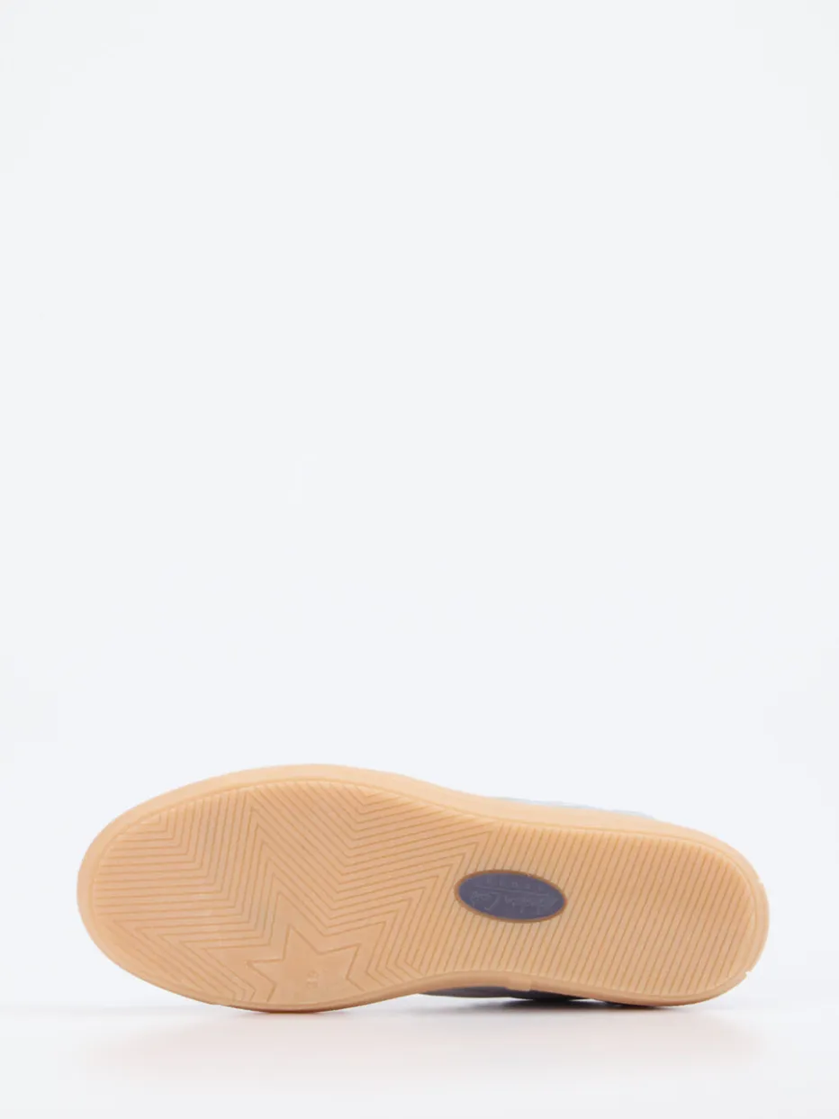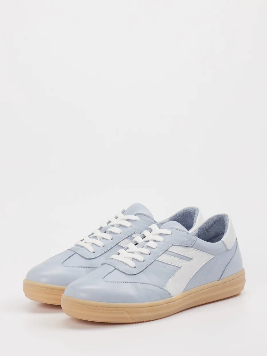 Der retro-inspirierte Sneaker von Andrea Conti vereint weiches Kalbleder mit glänzender Oberfläche und pastelliger Farbgebung – perfekt im aktuellen Streetwear-Kontext.