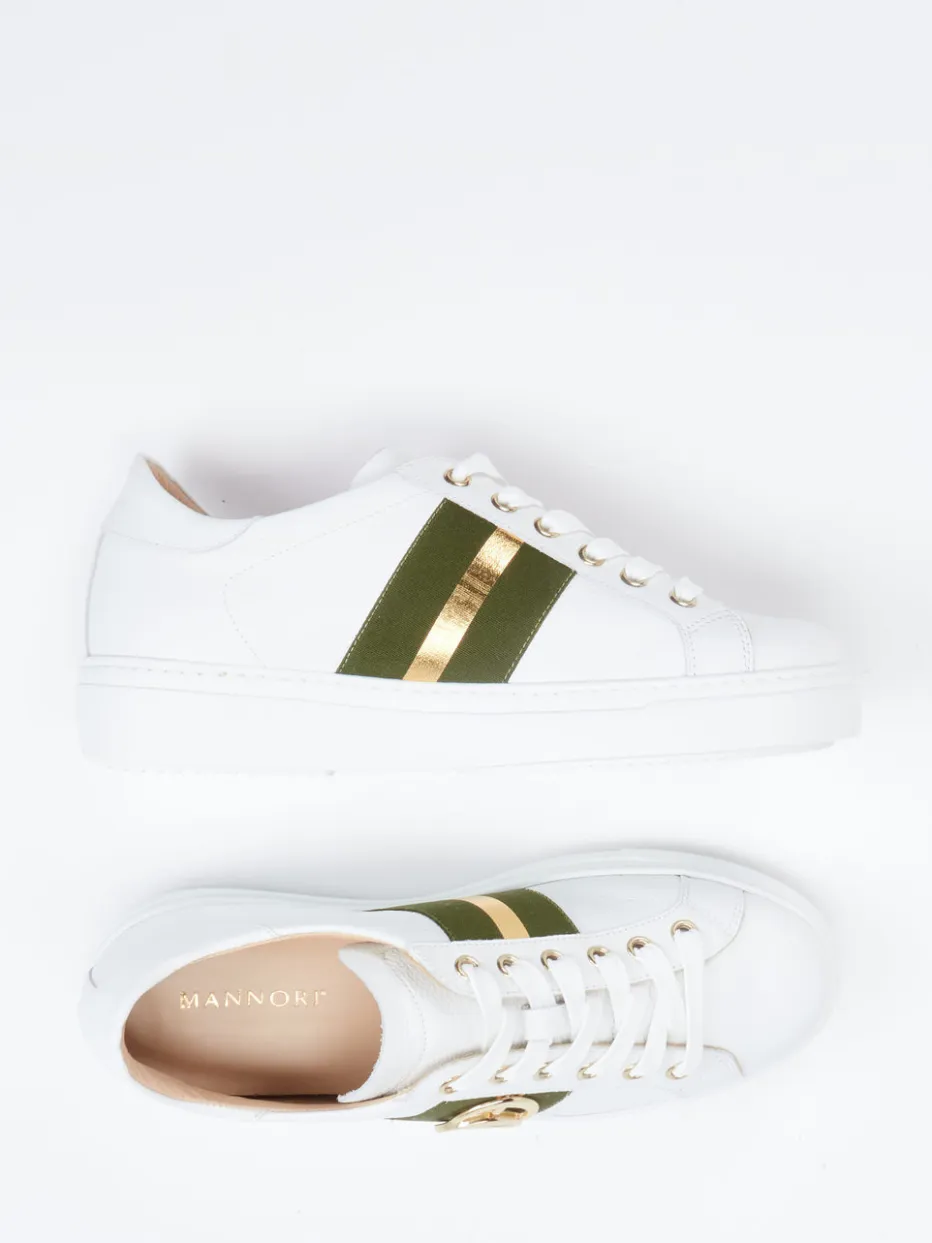 Italienischer Minimalismus trifft auf Metallic-Trend.Mannori interpretiert den Damen-Sneaker neu mit einer Kombination aus reduziertem Design und hochwertigem Materialeinsatz. Ideal für urbane Tageslooks überzeugt das Modell mit glattem, genarbtem Kalbleder in strahlendem Weiß. Die klassisch-runde Silhouette wird durch ein olivgrünes Textilband mit goldener Zierleiste seitlich aufgewertet. Goldfarbene Ösen und eine applizierte Metall-Logo-Applikation setzen elegante Highlights. Ein weiches Kalblederfutter sorgt innen für Komfort, während die stoßdämpfende Gummisohle alltagstaugliche Funktionalität bietet. Perfekt für trendbewusste Styles zwischen Büro und Freizeit. Kombiniert sich souverän mit cleanen Outfits oder Gold-Accessoires. Hochwertiger Komfort und elegante Zurückhaltung spiegeln Mannoris exklusiven Anspruch wider.
