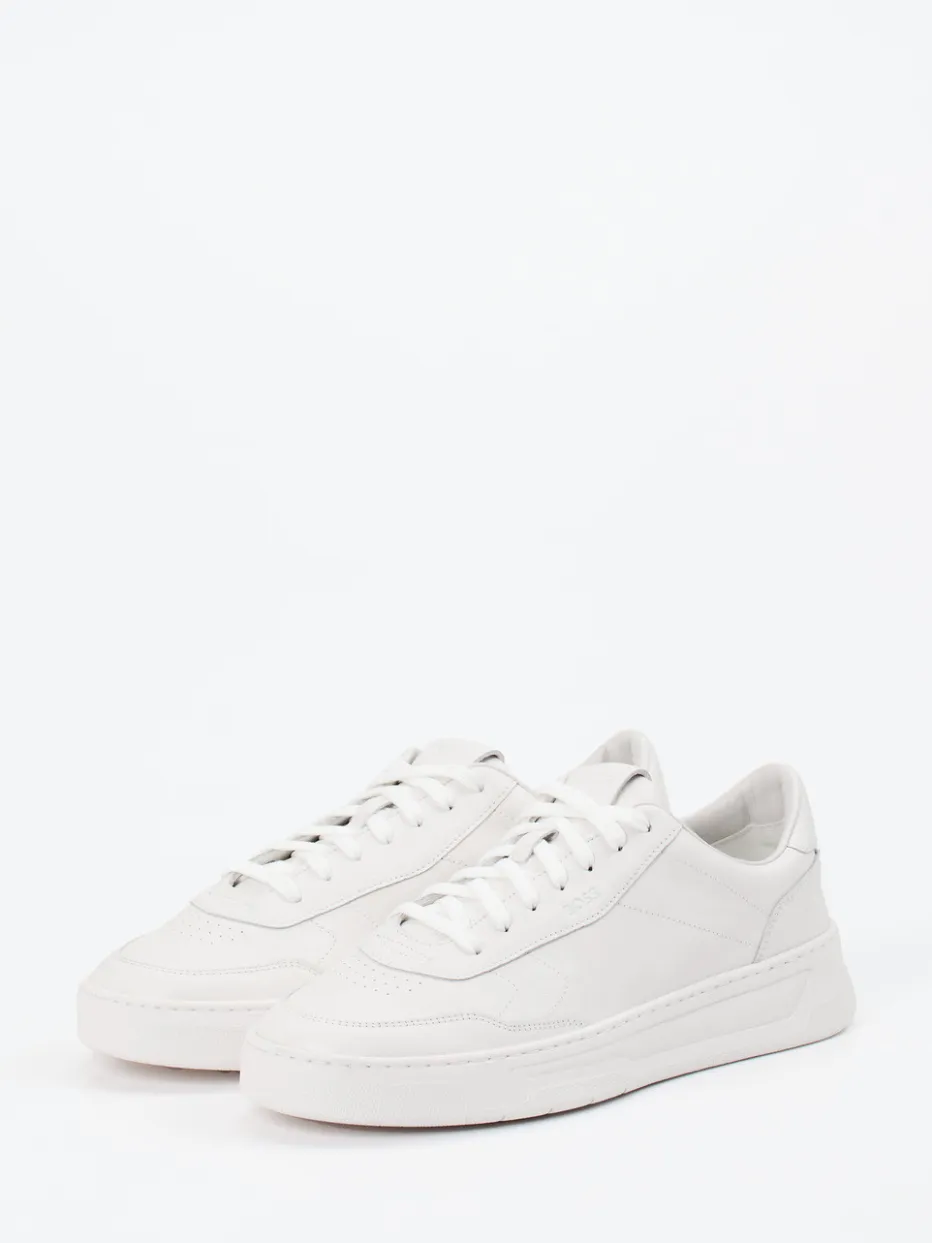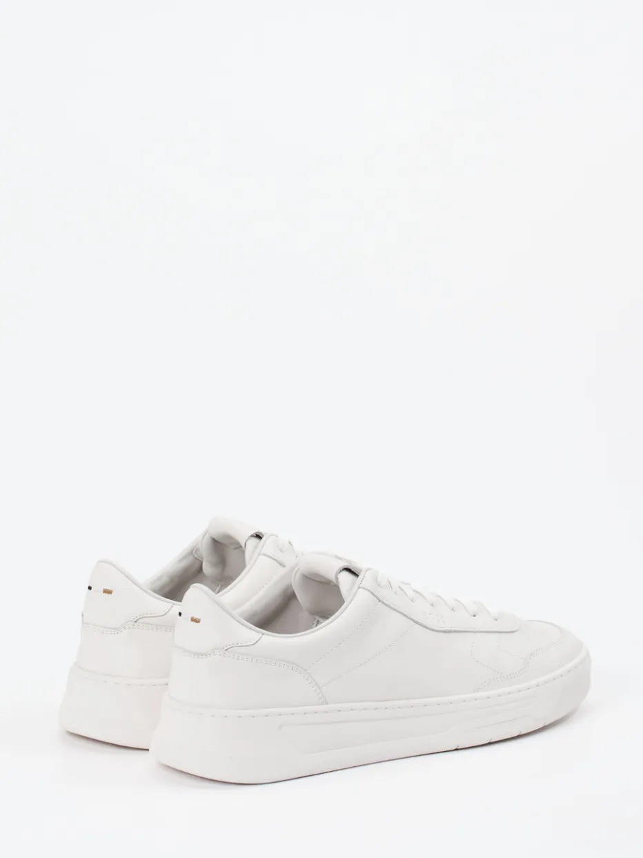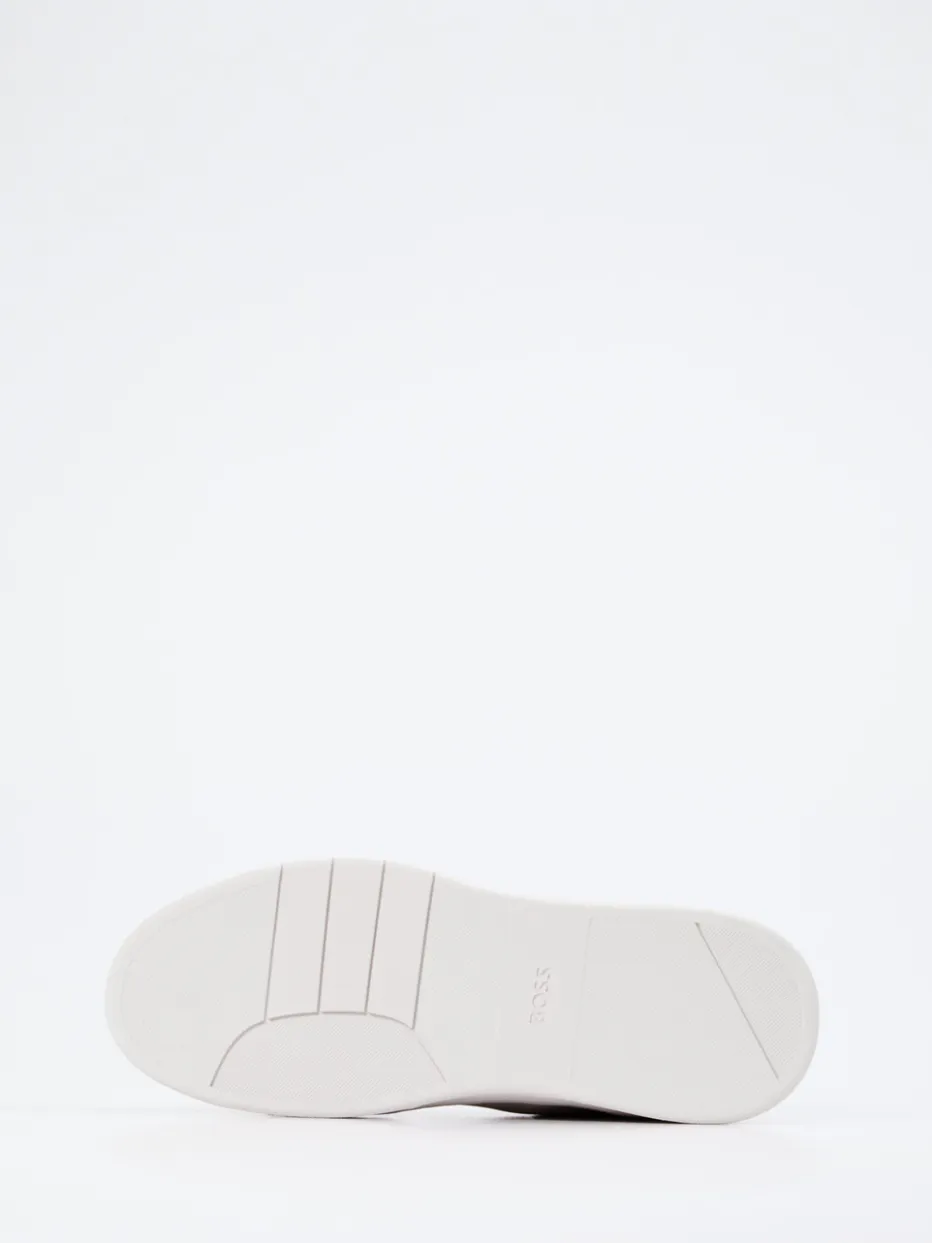 Understatement mit Struktur.Der Herren-Sneaker von Boss vereint minimalistisches Design mit hochwertiger Ausführung. Perfekt für gepflegte City-Outfits und entspannte Office-Tage: Das Modell überzeugt durch feines, angenehm weiches Kalbleder in Offwhite – glatt verarbeitet und tonig abgenäht. Die klassische, rund gehaltene Silhouette wird durch zurückhaltende Logo-Details an Seite und Ferse, eine dezente Schnürung sowie einen gepolsterten Einstieg unterstrichen. Eine strukturierte Gummisohle mit leichter Keilform greift die dynamische Linienführung des Schaftes auf. Stilistisch passt der Look perfekt zum „Quiet Luxury“-Trend. Ein vielseitiger Begleiter mit betonter Ästhetik – typisch Boss.