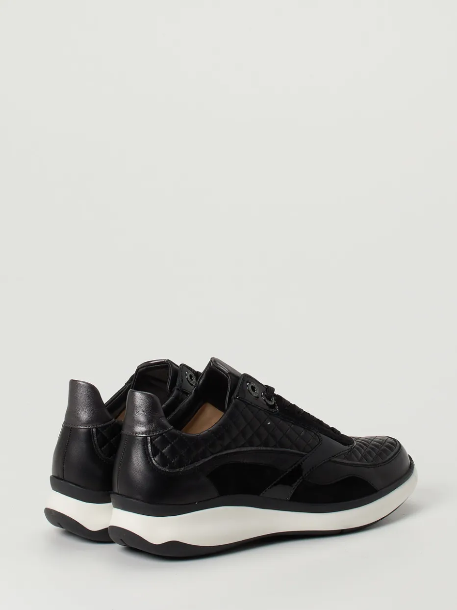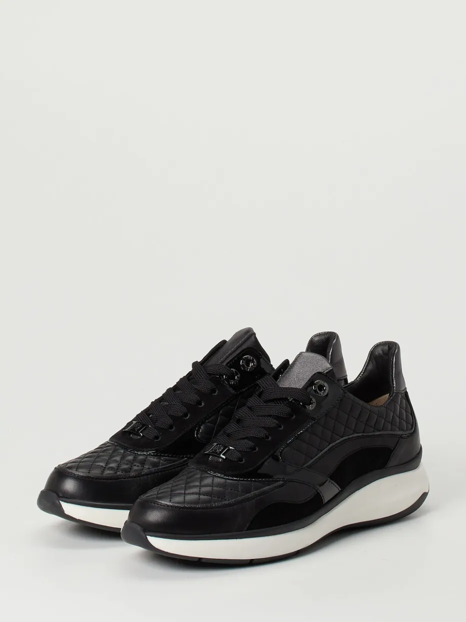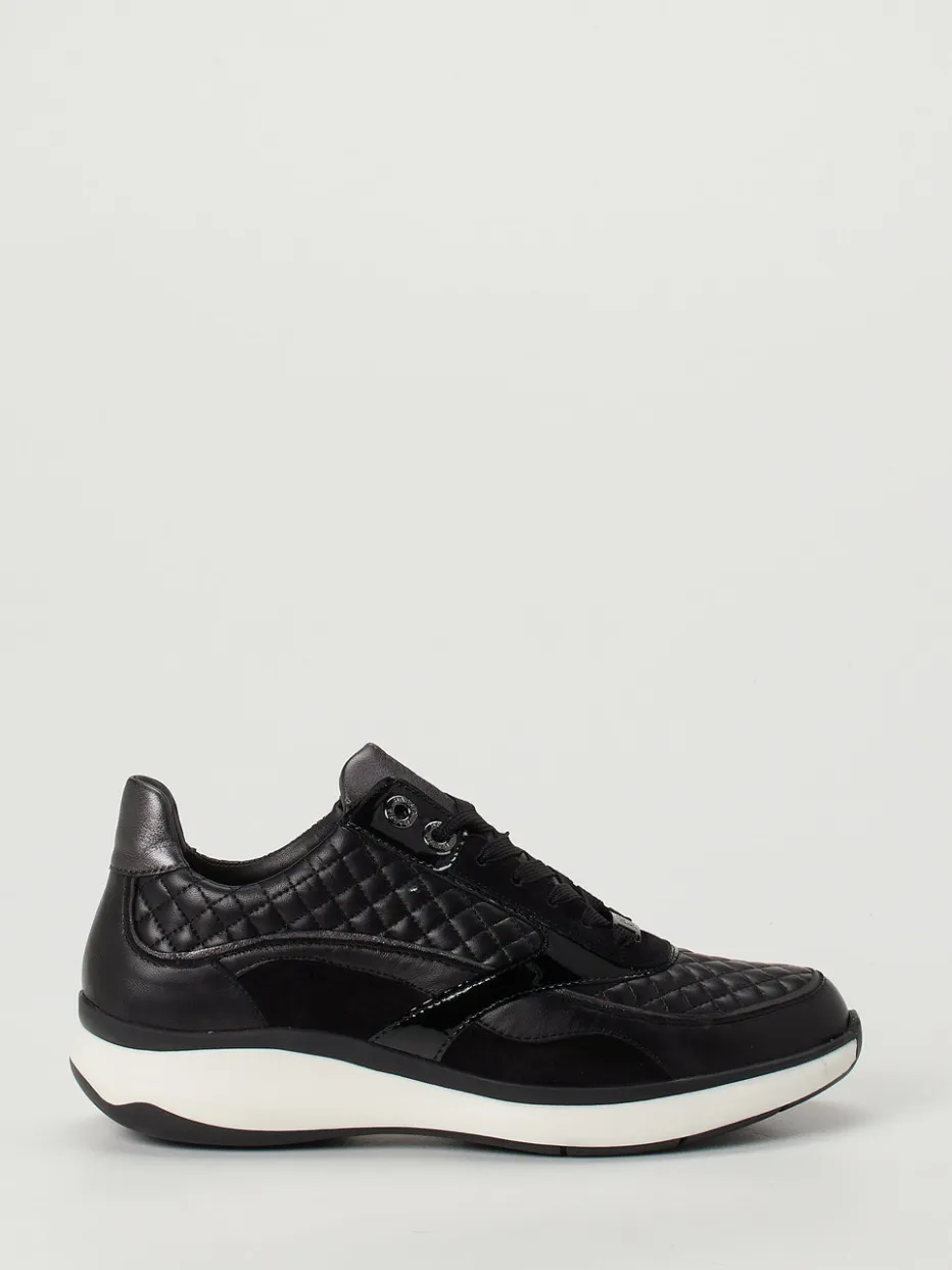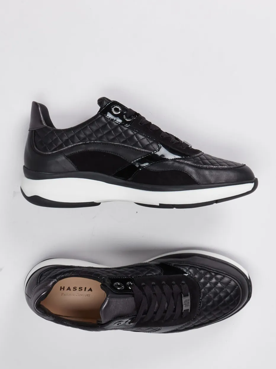 Sportliche Raffinesse trifft auf Materialkunst.Hassia bietet mit diesem Damen-Sneaker ein durchdachtes Komfortmodell im klassischen Schwarz. Ideal für stilbewusste Alltagssituationen oder entspannte Bürolooks: Das Obermaterial besteht aus feinem Kalbleder, ergänzt durch glänzende Lack- und samtige Veloursleder-Elemente mit edler Steppung. Die sportlich-abgerundete Silhouette, gepolsterte Ferse und verstärkte Gummisohle mit weißem Profil unterstreichen den hochwertigen Charakter. Dezente Glanzelemente und die Ripsschnürung fügen sich harmonisch in das moderne Quiet-Luxury-Design ein. Ein Bequemschuh, der Komfort und Ästhetik auf den Punkt bringt.