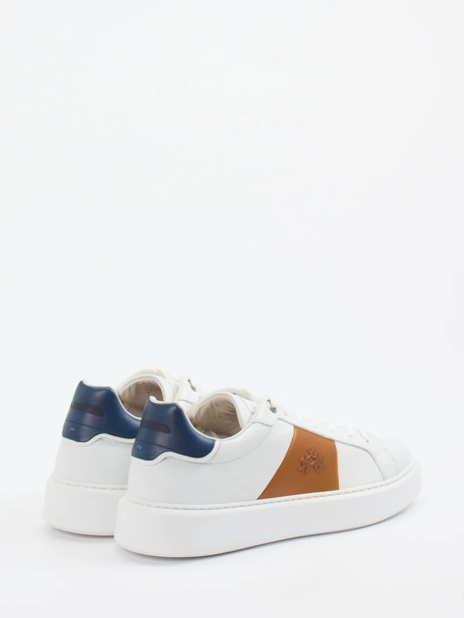 Puristischer Look mit mediterraner Raffinesse.Der Herren-Sneaker von La Martina zeigt sich als stilsicherer Allrounder. Klares Weiß trifft auf sanft genarbtes Kalbleder, ergänzt durch cognacfarbene Logo-Elemente und einen dunkelblauen Fersenbesatz – perfekt für moderne Outfits mit diskretem Color-Blocking. Die klassische, runde Form mit geprägtem Markenlogo und kontrastierenden Besätzen unterstreicht die hochwertige Verarbeitung. Gummisohle, lederbezogenes Fußbett und Schnürung bieten Tragekomfort im Alltag wie im Büro. Ein Schuh, der modische Zurückhaltung mit italienischer Ästhetik vereint. La Martina steht für souveräne Eleganz mit detailverliebtem Designanspruch.
