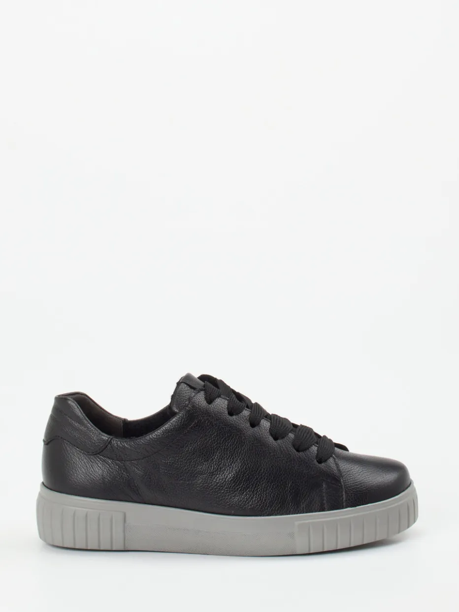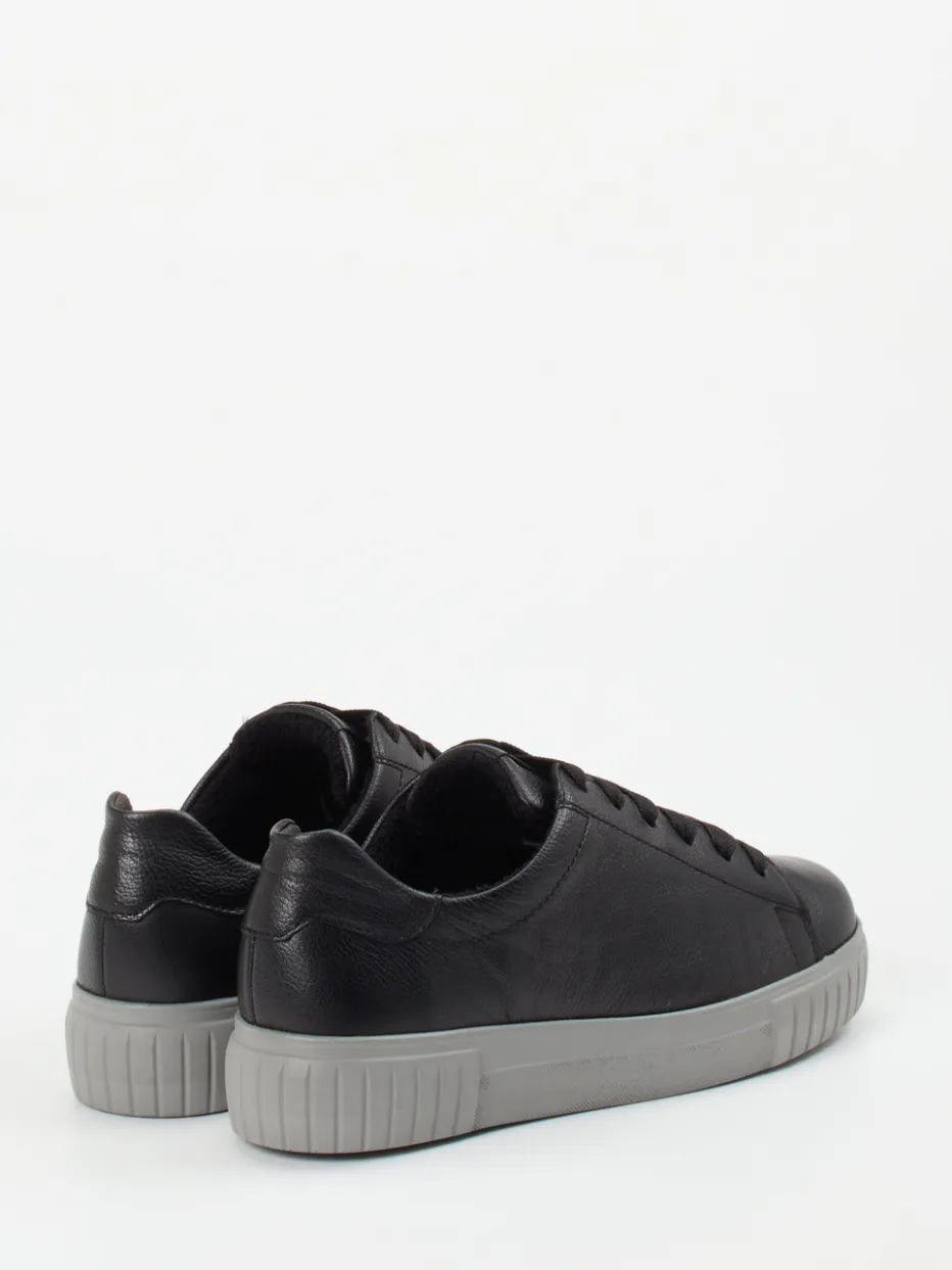 Ob im Office oder bei urbanen Erkundungstouren – das genarbte Kalbleder in sattem Schwarz unterstreicht die hochwertige Anmutung. Die runde Silhouette, breite Schnürbänder und die tonige Verarbeitung sorgen für ein zurückhaltend-edles Gesamtbild. Dank gepolstertem Schaft, PU-Luftpolstersohle mit Rillenprofil und Wechselfußbett ist ganztägiger Komfort garantiert. Inspiriert von Streetwear und dem Trend zu Monochrome Looks, passt der Sneaker ideal zur schmal geschnittenen Stoffhose wie zur weiten Jeans.