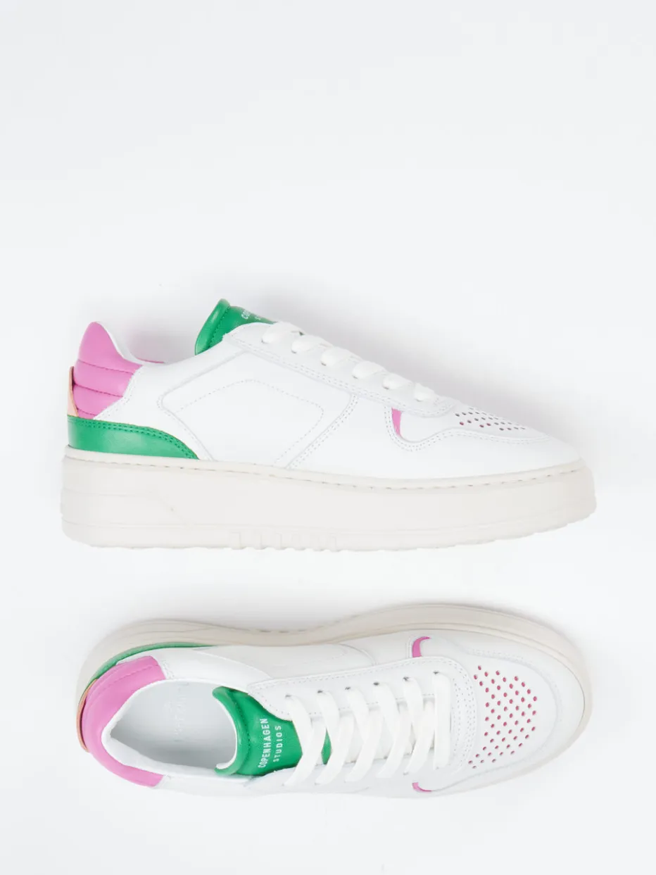 Statement-Sneaker für moderne Looks.Die Marke Copenhagen zeigt mit diesem Damen-Sneaker eine gelungene Symbiose aus Minimalismus und Trendbewusstsein. Für urbane Freizeitmomente eignet sich dieser Low-Top ideal. Das weiße Kalbleder, kombiniert mit glatter Oberfläche und perforierter Zehenkappe, bietet ein hochwertiges Finish. Farbige Overlays in Grün, Pink und Apricot setzen frühlingshafte Akzente im angesagten Color-Blocking. Die voluminöse Plateau-Gummisohle mit Markenprägung betont die klassische Retro-Court-Form, während gepolsterte Partien an Ferse und Lasche den Tragekomfort verstärken. Besonders stimmig zu Oversized-Hemden oder soften Crossbody-Bags. Dezente Logos und sportive Linienführung unterstreichen den typischen Copenhagen-Look.
