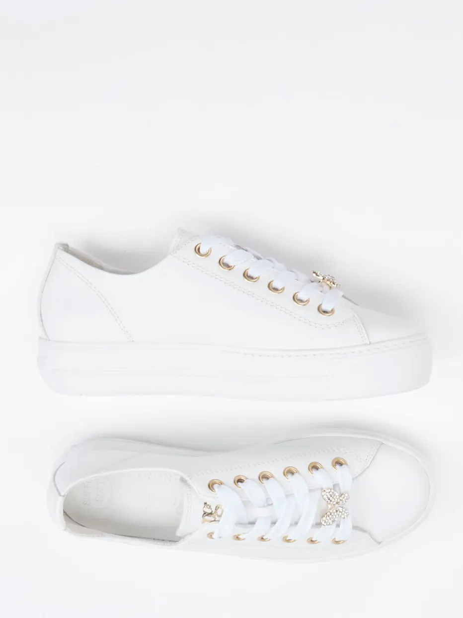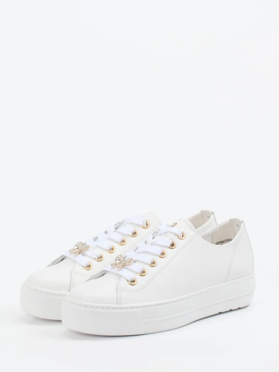 Casual Chic mit femininem Glanz.Der weiße Low-Top Sneaker von Paul Green vereint Minimalismus mit modischer Raffinesse. Ob als stilvolle Ergänzung zum sommerlichen Freizeitlook oder als glanzvoller Akzent im Party-Outfit – dieser Schuh überzeugt mit glattem, genarbtem Kalbleder und liebevoll verarbeiteten Details. Goldfarbene Ösen und ein funkelnder, abnehmbarer Schmetterling setzen feminine Highlights. Die klassisch abgerundete Silhouette wird durch die 3,5 cm hohe Plateau-Gummisohle betont, die Streetwear-Flair und Komfort bietet. Optimal kombinierbar mit weißen Taschen oder goldfarbenen Accessoires. Ein femininer Trendsneaker mit der typischen Passform-Kompetenz von Paul Green.