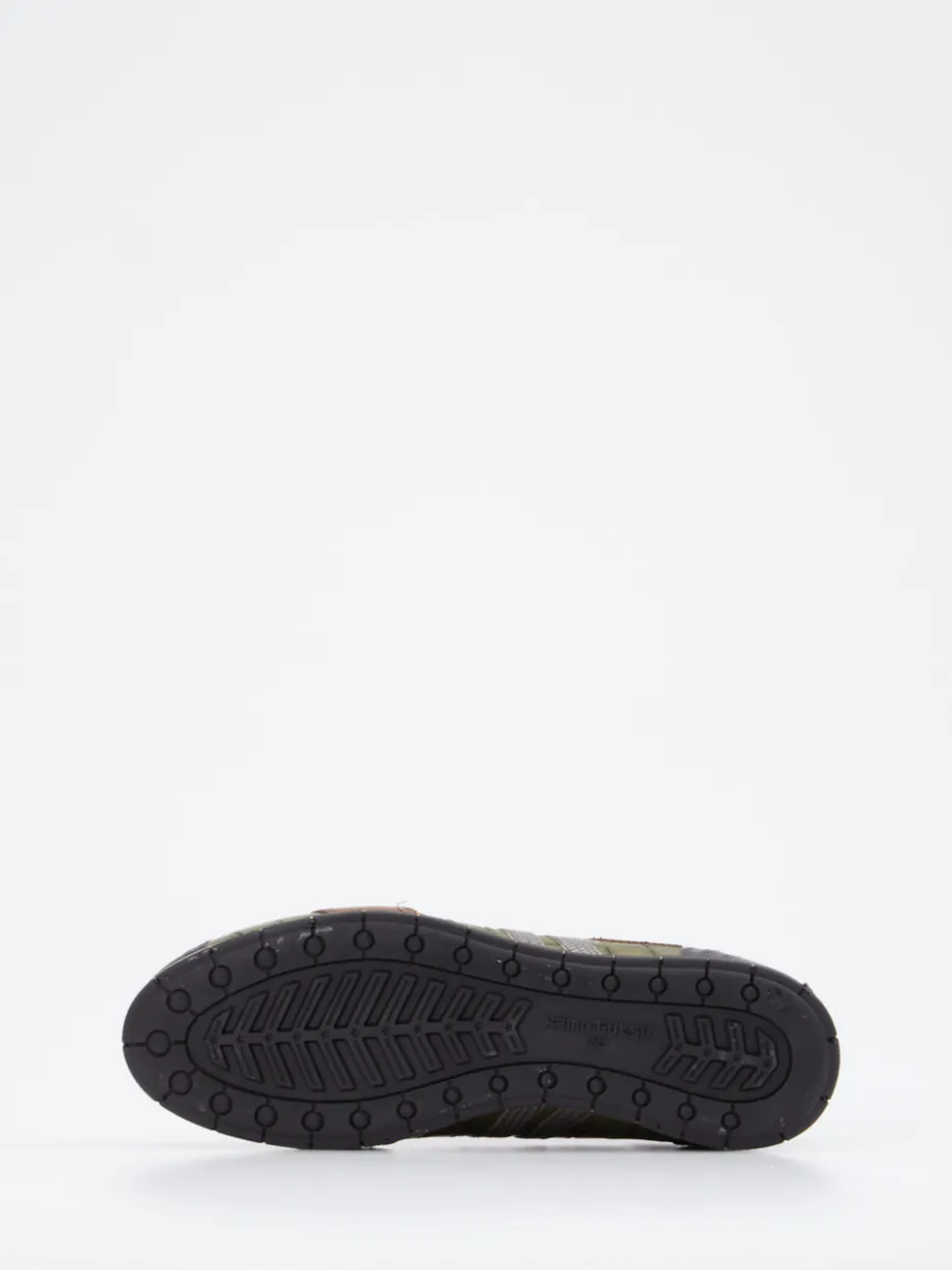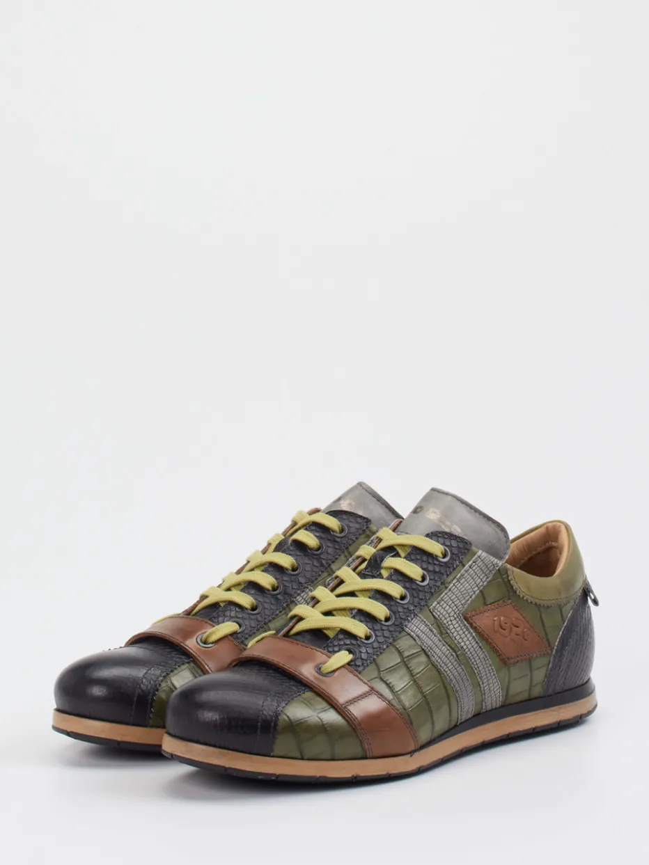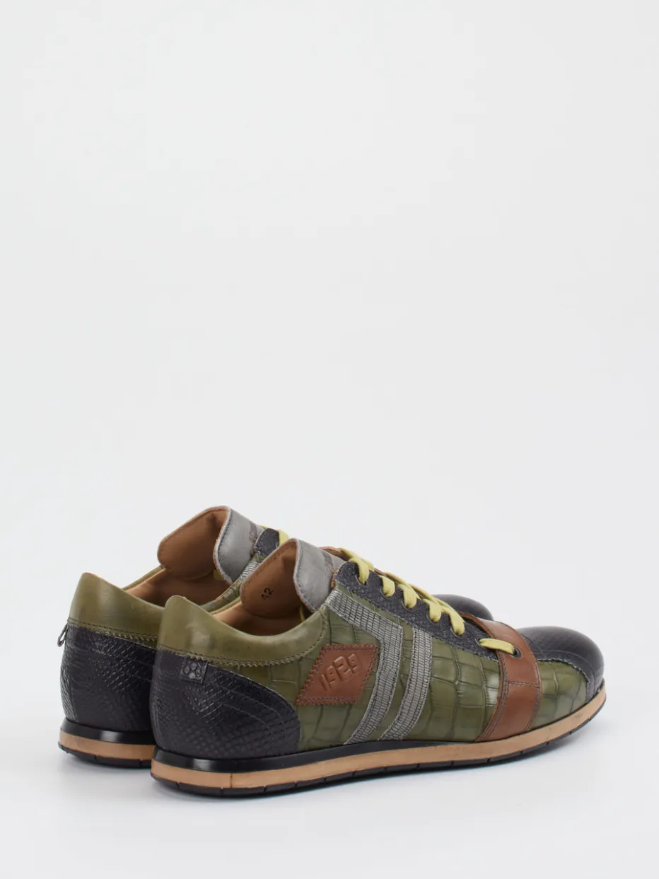 Retro trifft Reptilstruktur.Kamo Gutsu zeigt mit diesem Herren-Sneaker der Linie Tifo 030 ein stilvolles Modell für Alltag und Freizeit. Das Design verbindet olivgrünes Kalbleder mit Kroko-Prägung und kontrastierenden Elementen in Schwarzblau sowie cognacfarbenen Zierstreifen. Die klassische flache Silhouette mit sportlicher Schnürung wird durch Kontrastnähte und metallische Details akzentuiert. Innen sorgt ein hochwertiges Lederfutter samt gepolstertem Wechselfußbett für Komfort. Der Look vereint Streetwear mit dem Trend „Quiet Luxury“ – ideal zu grauen Jeans oder olivgrüner Bomberjacke. Hochwertige Materialien und Retro-inspirierte Details prägen die Handschrift von Kamo Gutsu.