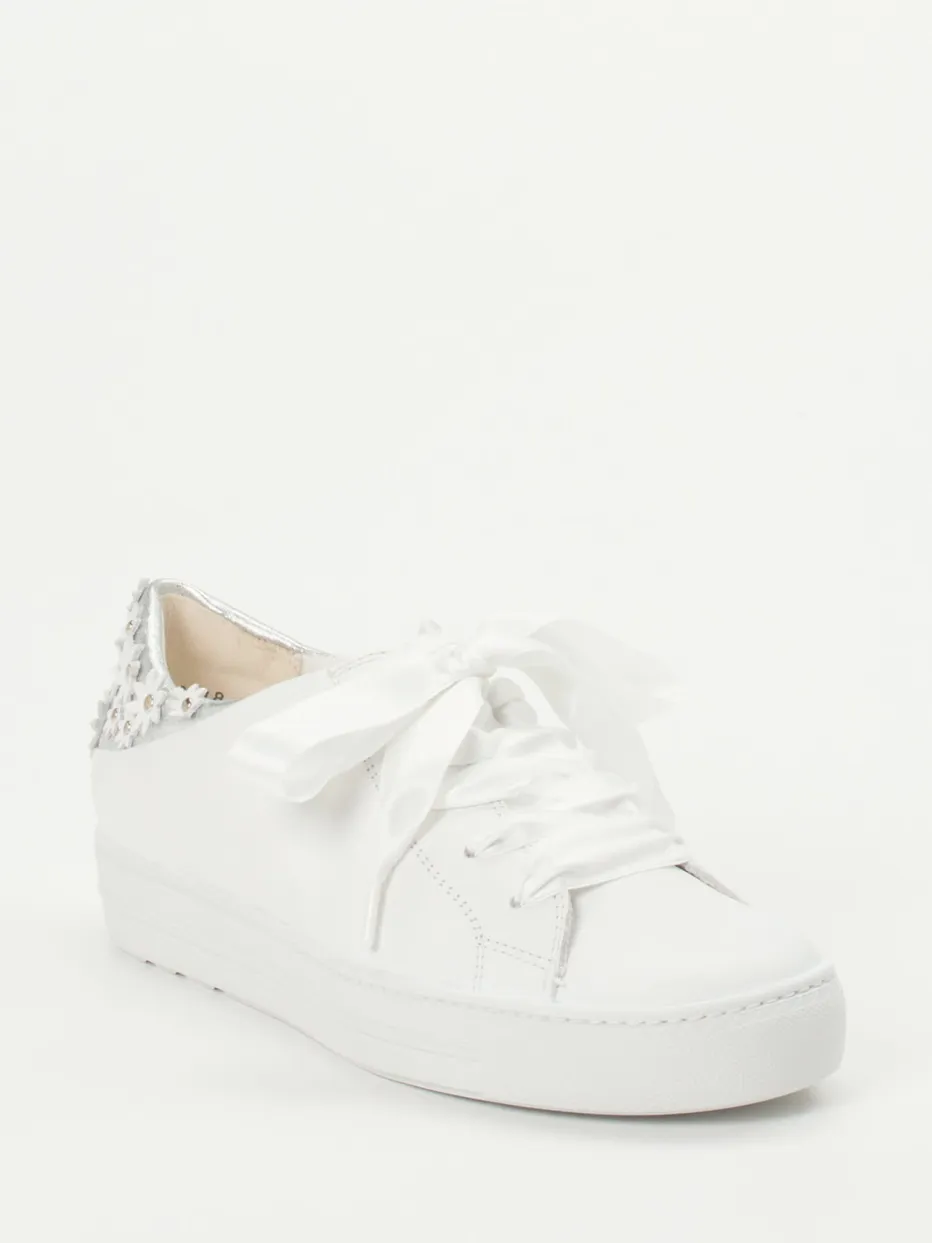 Verspielt und feminin – neu interpretiert.Der Sneaker von Paul Green bringt frische Romantik in die Damenwelt urbaner Casual-Looks. Für sommerliche Spaziergänge oder entspannte Café-Besuche vereint er hochwertiges Kalbleder mit einer samtig-matten Oberfläche und floraler Fersengestaltung. Die weiße Farbgebung wird durch silberne Akzente an der Ferse effektvoll ergänzt, während breite Satinbänder als Schnürung den femininen Look unterstreichen. Die abgerundete Silhouette, leichten Plateauanteile und die weich gepolsterte Gummisohle sorgen für Komfort bei modischer Attitüde. Inspiriert vom „Quiet Luxury“-Trend passt der Schuh perfekt zu zarten Blusen oder fließenden Röcken. Ausdrucksstarke Details und exzellente Verarbeitung – typisch Paul Green.