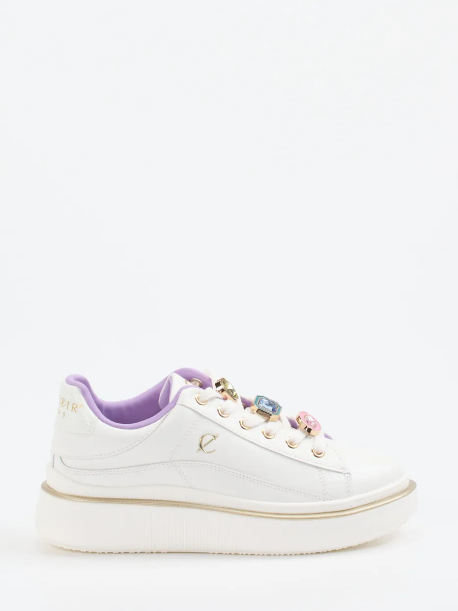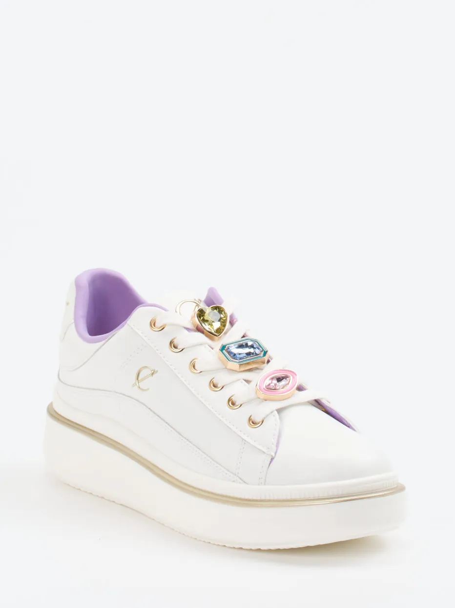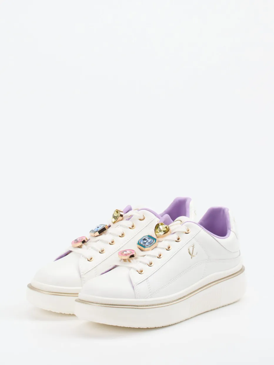 Funkelnd im Fokus.CAFèNOIR bringt mit diesem Damen-Sneaker frischen Glanz in die Streetwear-Kategorie. Ideal für lebendige Alltagsmomente genauso wie für expressive Partynächte zeigt sich das Modell aus hochwertigem Kalbleder mit glänzender Oberfläche. Off-White und fliederfarbene Töne bestimmen den Look ebenso wie die auffällige Schmucksteinverzierung samt goldfarbener Akzente an Ösen und Sohlenlinie. Die Plateausohle unterstreicht den chunky Charakter und verleiht urbanes Volumen. Inspiriert vom Y2K-Trend überzeugen diese Sneaker in Kombination mit monochromen Pastell-Outfits oder oversized Streetwear-Komponenten. CAFèNOIR verbindet luxuriöse Materialien mit charakterstarkem Design.