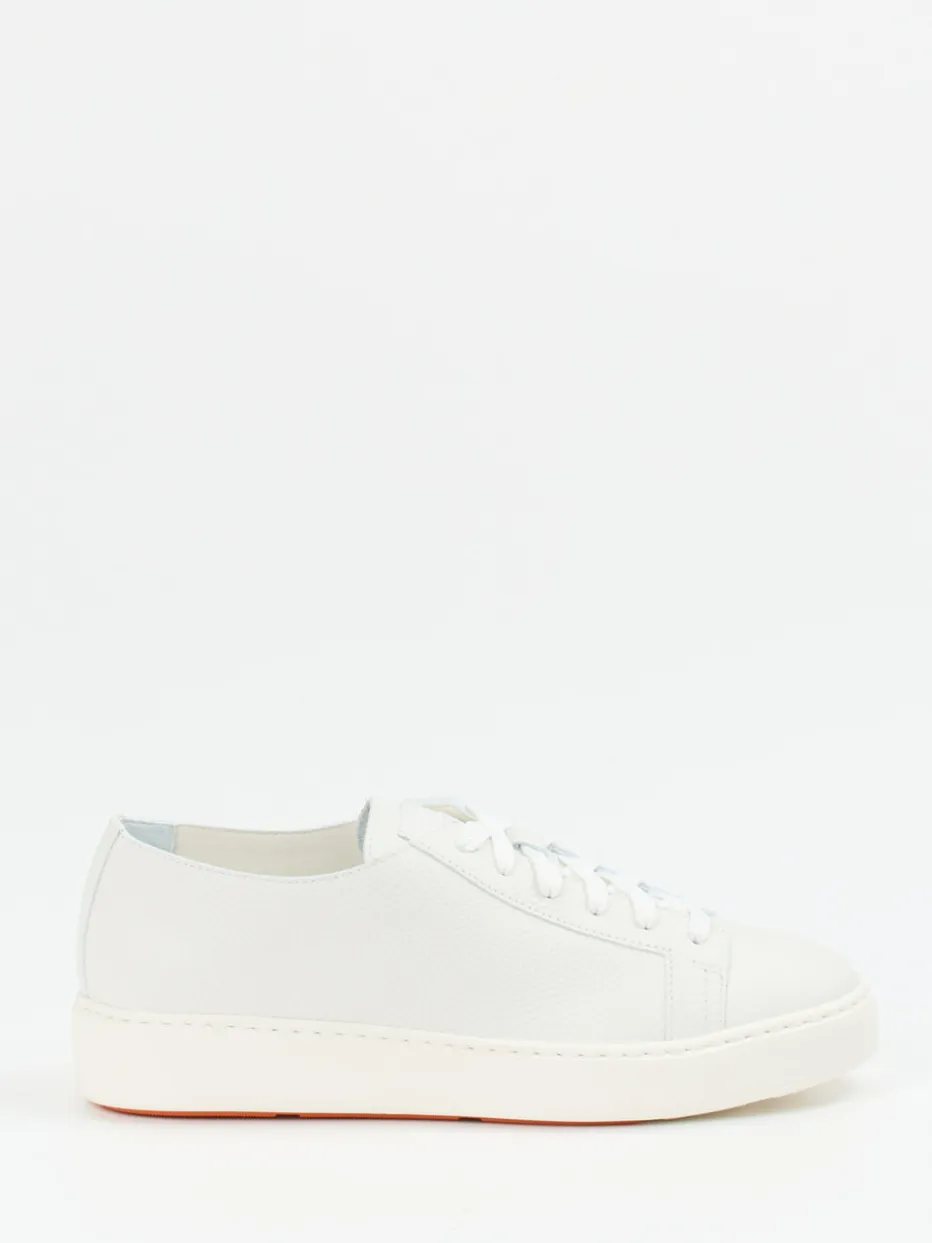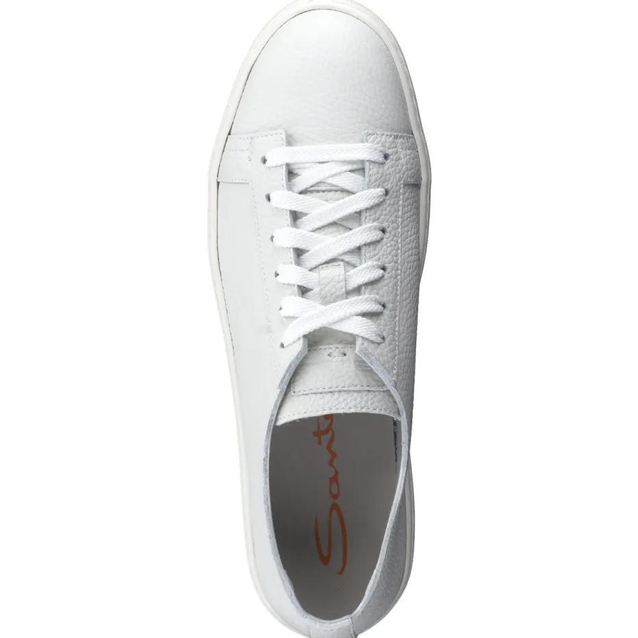 Dieser sportlich-feminine Sneaker der Marke Santoni besticht durch seine Wertigkeit. Das ungefütterte, weiße Kalbleder ist herrlich weich und überzeugt auf den ersten Blick durch die sportive Ausrüstung. Weiße, breite Schnürbänder runden die modische Aussage des schlank geschnittenen Sneakers ab. Handwerklichkeit vermittelt die durchgenähte, weiße Sneakersohle. Sie ist wunderbar flexibel und verspricht dadurch Bequemlichkeit. Die Lederinnensohle ist austauschbar.