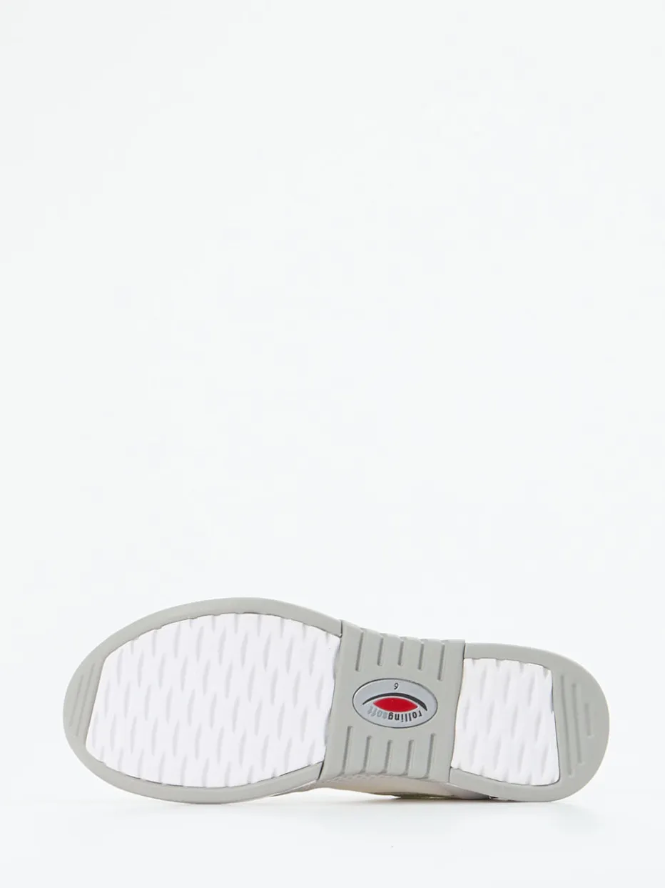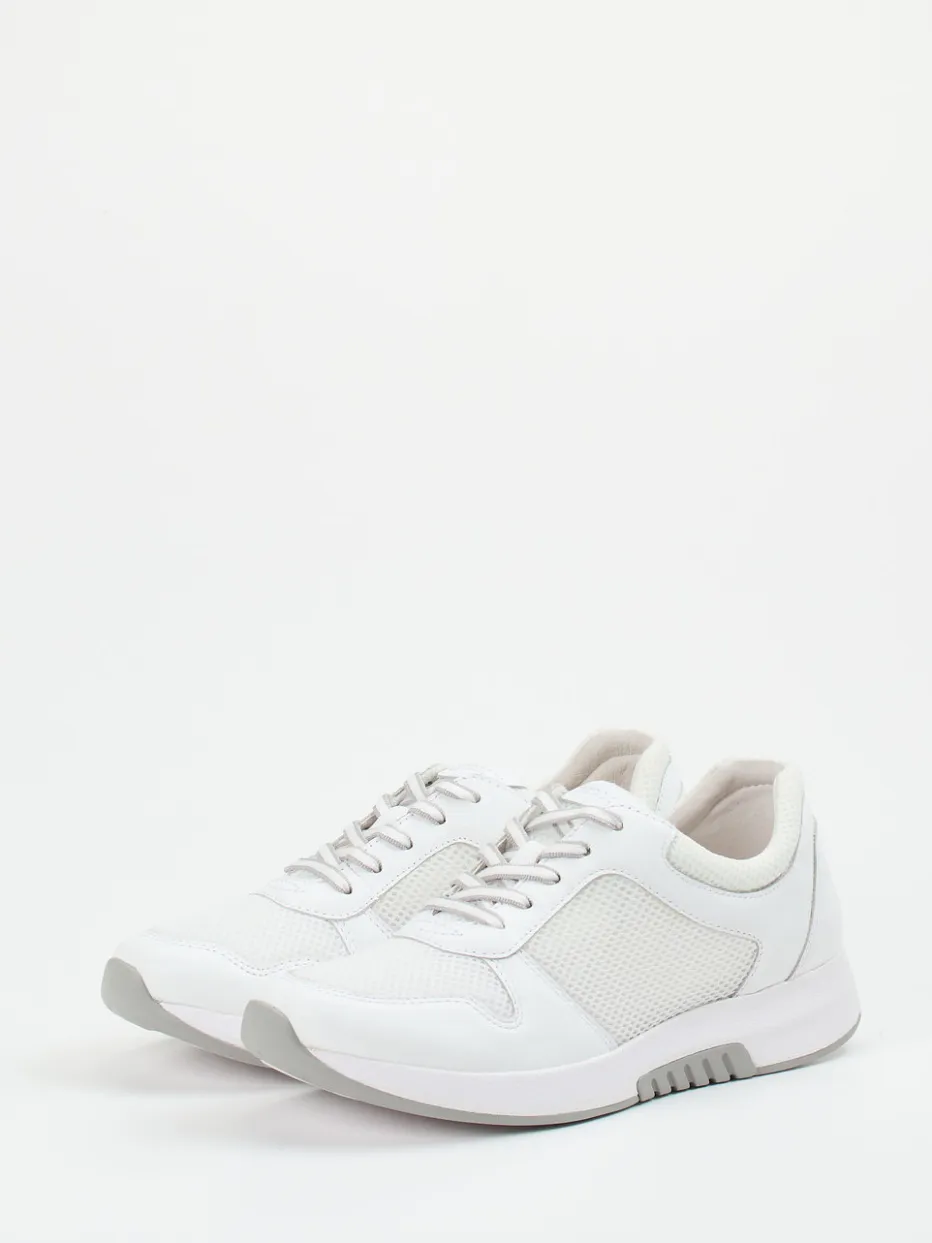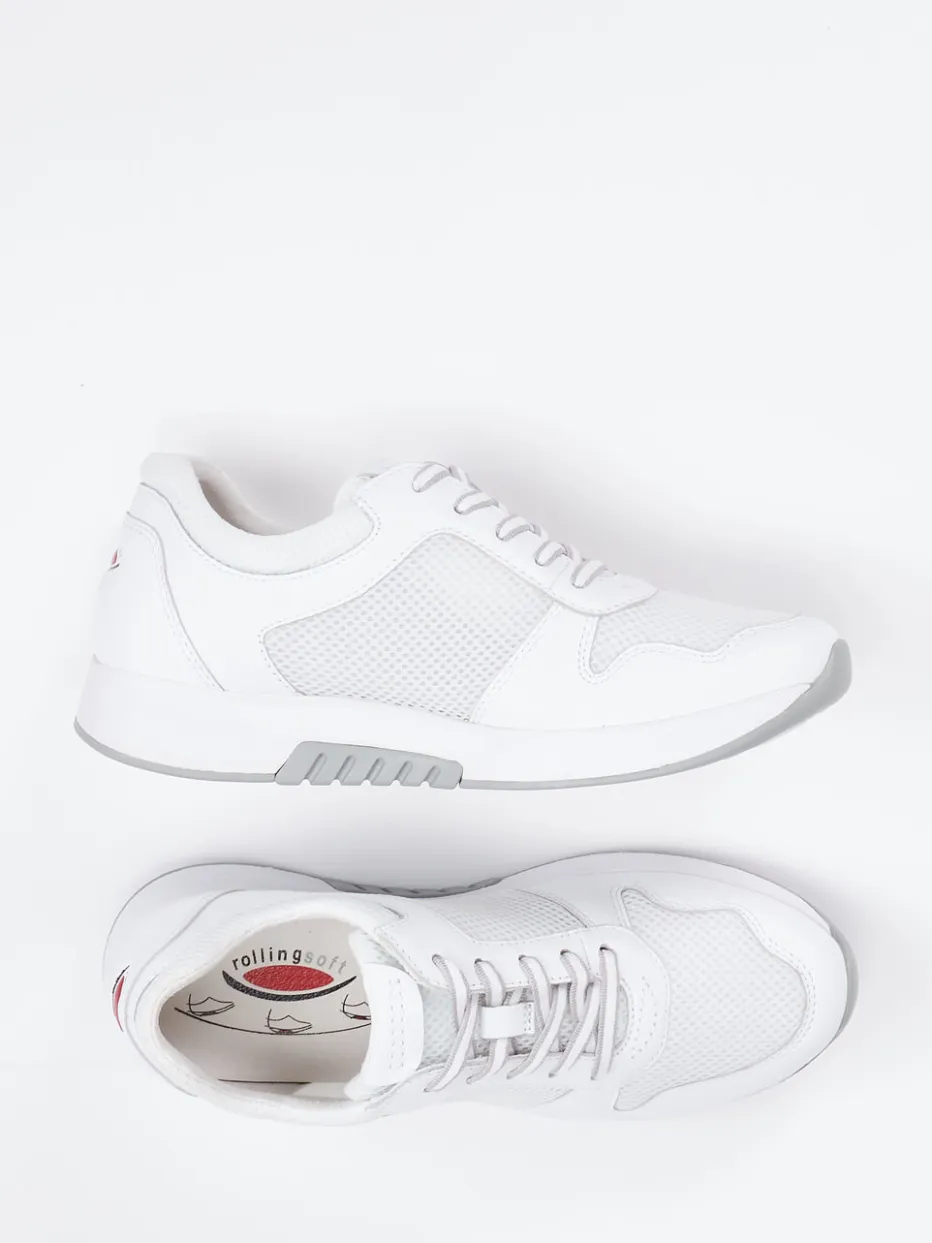 Sportliche Leichtigkeit, stilvoll umgesetzt.Gabor Comfort präsentiert einen innovativen Komfort-Sneaker aus der Rollingsoft-Serie. Der cleane Offwhite-Ton in Kombination mit Kalbleder und matt strukturierten Mesh-Zonen verleiht dem Schuh einen modernen, sportlich-neutralen Charakter. Die erhöhte Gummisohle unterstützt das natürliche Abrollverhalten, während ein gepolsterter Schaftrand zusätzlichen Komfort bietet. Dezente Details wie die Ton-in-Ton-Nähte und die klassische Silhouette ordnen das Modell stilsicher dem „Quiet Performance“-Trend zu. Ideal zur Komfortjeans oder minimalistischen Athleisure-Outfits. Mit ergonomischer Laufsohle und atmungsaktivem Aufbau für entspanntes Tragen über den Tag hinweg.