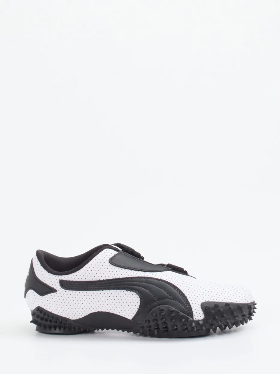 Unkonventionelles Design mit Retro-Futurismus.Puma präsentiert diesen weißen Low-Top-Sneaker mit auffälliger Silhouette. Ideal für stilbewusste Freizeit- und Streetwear-Looks: Der Sneaker aus perforiertem Kalbleder kombiniert eine matt strukturierte Oberfläche mit schwarzem Logo-Print und einem charakteristischen Klettverschluss. Die aggressive Außensohle mit Y2K-Anklängen setzt ein gestalterisches Ausrufezeichen und greift Retro- und Techwear-Elemente auf. Das Ortholite-Fußbett sorgt für optimale Belüftung und angenehme Dämpfung. Besonders gut kombinierbar mit sportlichen Tights oder Tech-Accessoires. Ein visuelles Statement mit maximaler Funktionalität – typisch Puma.