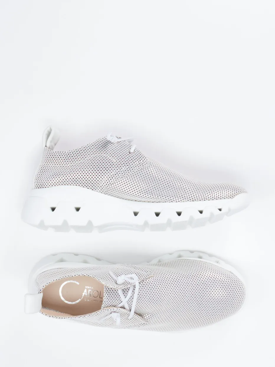 Der Sneaker von Donna Carolina vereint atmungsaktives Mesh mit edlem Kalbleder und liegt mit Metallic-Elementen sowie Chunky-Sohle voll im Trend.