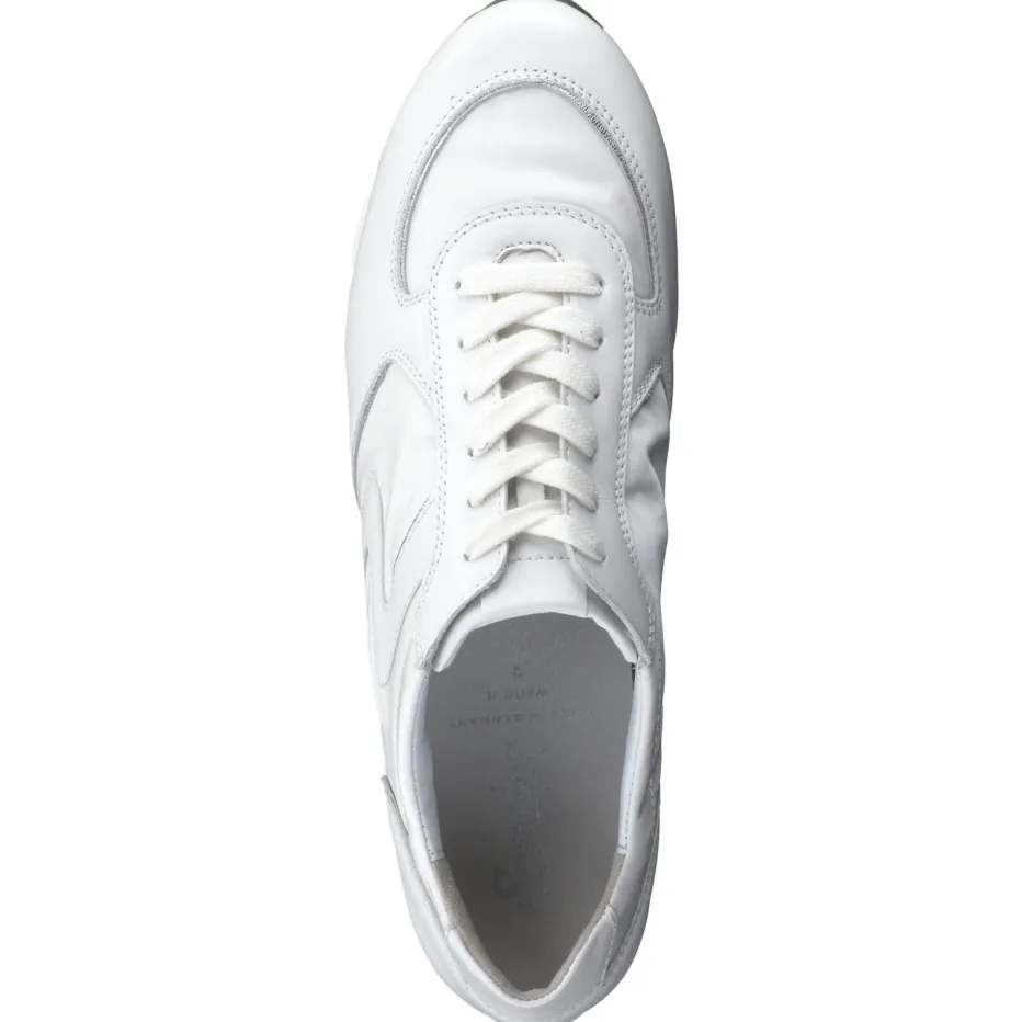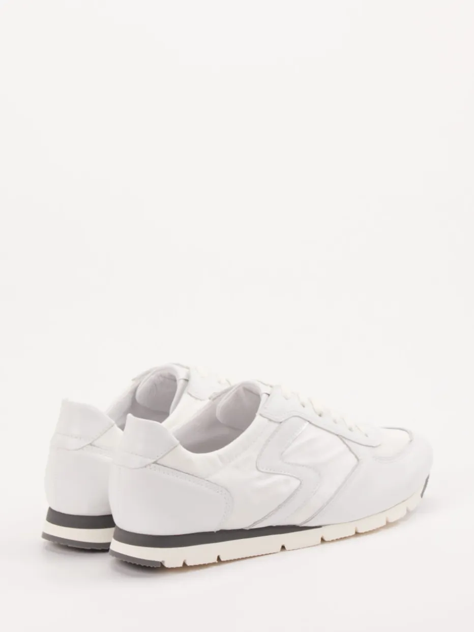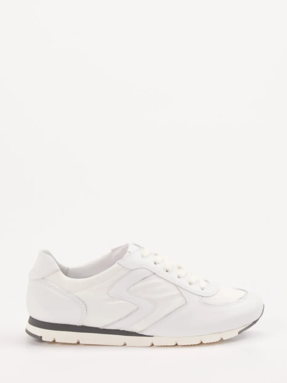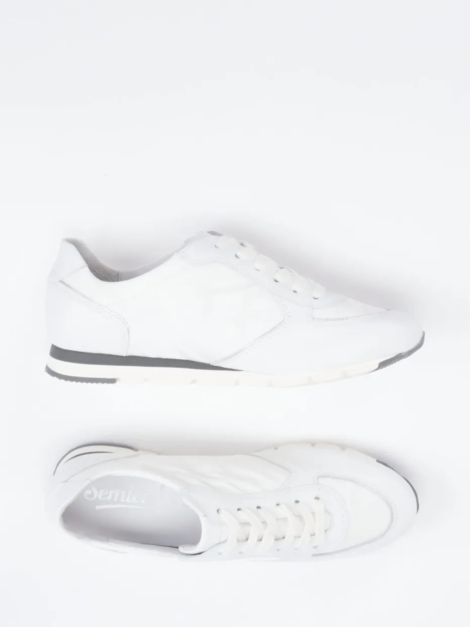 Moderner Minimalismus trifft Vintage-Charme.Der Sneaker von Semler zeigt sich als stilvoller Begleiter in der Damen-Kategorie. Ideal für entspannte Tage in der Stadt oder auf Reisen. Gefertigt aus weißem Kalbleder kombiniert mit weißem Nylon entsteht eine edel glatte Oberfläche, ergänzt durch silberfarbene Metallicelemente. Die charakteristisch flache Retro-Runner-Silhouette in Offwhite wird durch eine profilierte Gummisohle in Grau und Weiß akzentuiert. Diese bietet sicheren Halt, der gepolsterte Schaftrand und das wechselbare Fußbett sorgen für Komfort. Der Look ist von der Ästhetik der 90er-Jahre und der aktuellen Quiet-Luxury-Tendenz inspiriert. Lässt sich ideal zu hellen Casual-Styles und sommerlichen Accessoires kombinieren – mit typischem Semler-Komfortanspruch.