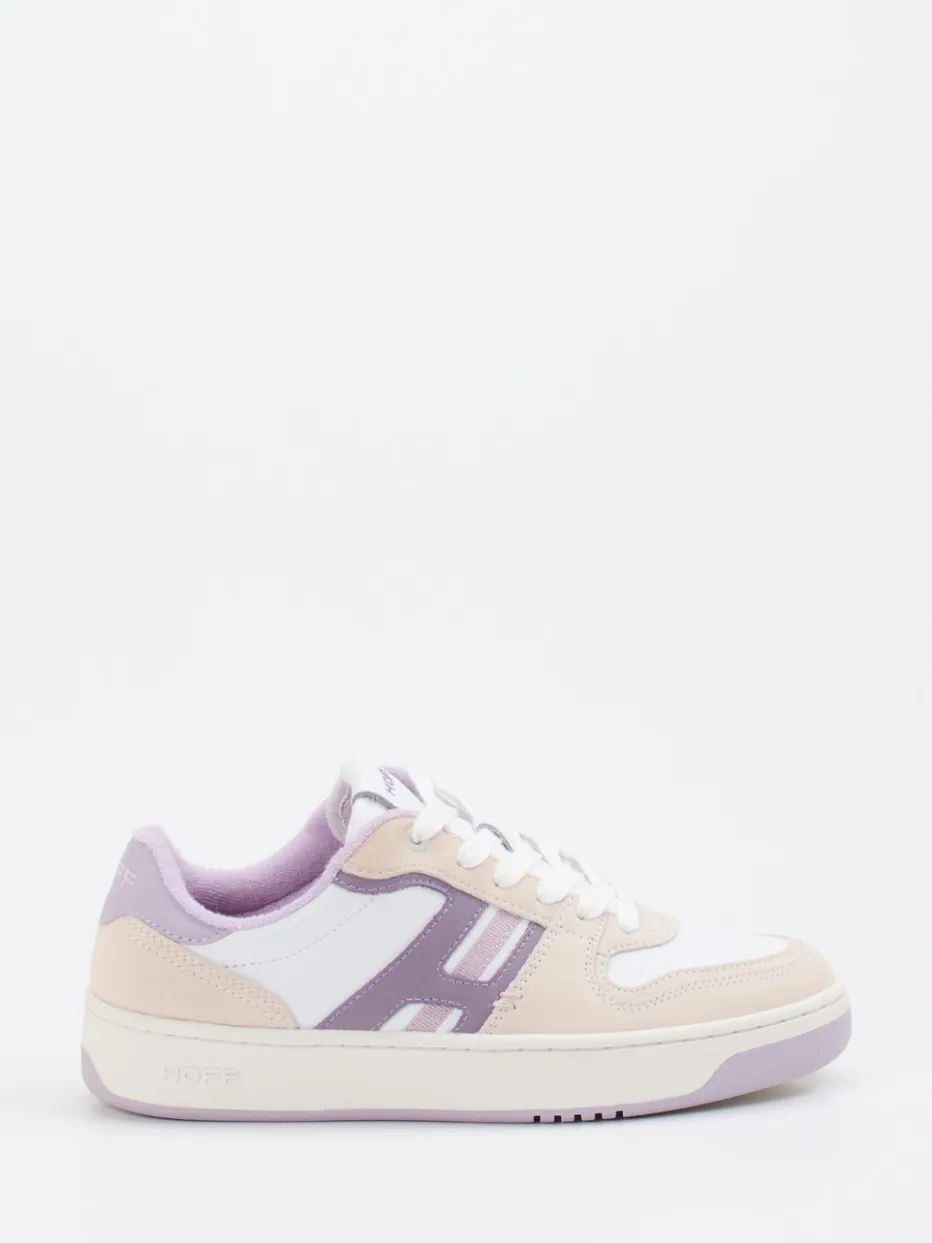 Pastelltöne mit Retro-Flair.THE HOFF BRAND präsentiert einen Damen-Sneaker im Low-Top-Design mit frischem Look für den urbanen Alltag. Ideal für einen Spaziergang in der Stadt oder den entspannten Wochenend-Look: Das Modell vereint weißes, angenehm weiches Kalbleder mit sportiven Veloursleder-Overlays und einer klassisch-sportlichen Silhouette. Ton-in-Ton-Nähte und ein lilafarbenes Markenlogo sorgen für dezente Akzente. Innen bietet atmungsaktives Textilfutter mit Memory-Foam-Sohle komfortables Laufgefühl. Die rutschhemmende Gummisohle mit zweifarbiger Profilstruktur rundet das Design funktional ab. Inspiriert von Streetwear und Y2K-Trends überzeugt dieser Sneaker als modisches Statement zu Jeans oder leichten Kleidern. Stilbewusste Freizeitästhetik mit modernem Komfort-Know-how von THE HOFF BRAND.