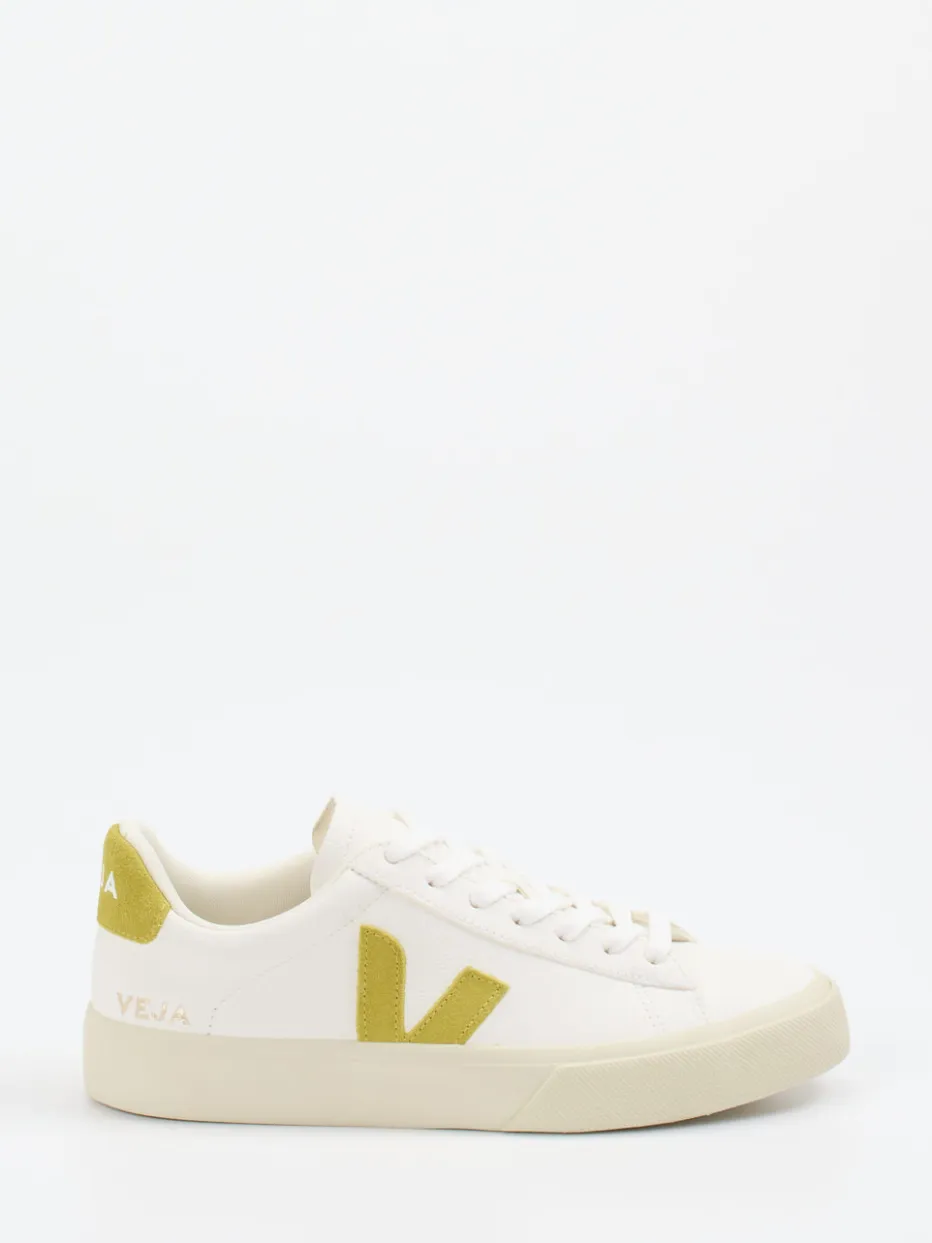 Urbaner Minimalismus mit Statement.Veja präsentiert einen Sneaker für Damen und Herren, der Nachhaltigkeit stilvoll interpretiert. Ideal für entspannte Alltagsmomente überzeugt dieser Low-Top durch chromfrei gegerbtes Kalbleder mit feiner Narbung und naturweißer Canvas-Optik. Currygelbe Veloursleder-Details an Fersenpatch und Logo geben subtile Tiefe. Die klassische flache Silhouette trifft auf eine robuste cremefarbene Gummisohle, während feine Ton-in-Ton-Nähte das puristische Design unterstreichen. Ein Modell für Fans unisexer Ästhetik mit einem Gespür für leise Statements. Der Sneaker vereint französisches Understatement mit nachhaltiger Markenphilosophie.
