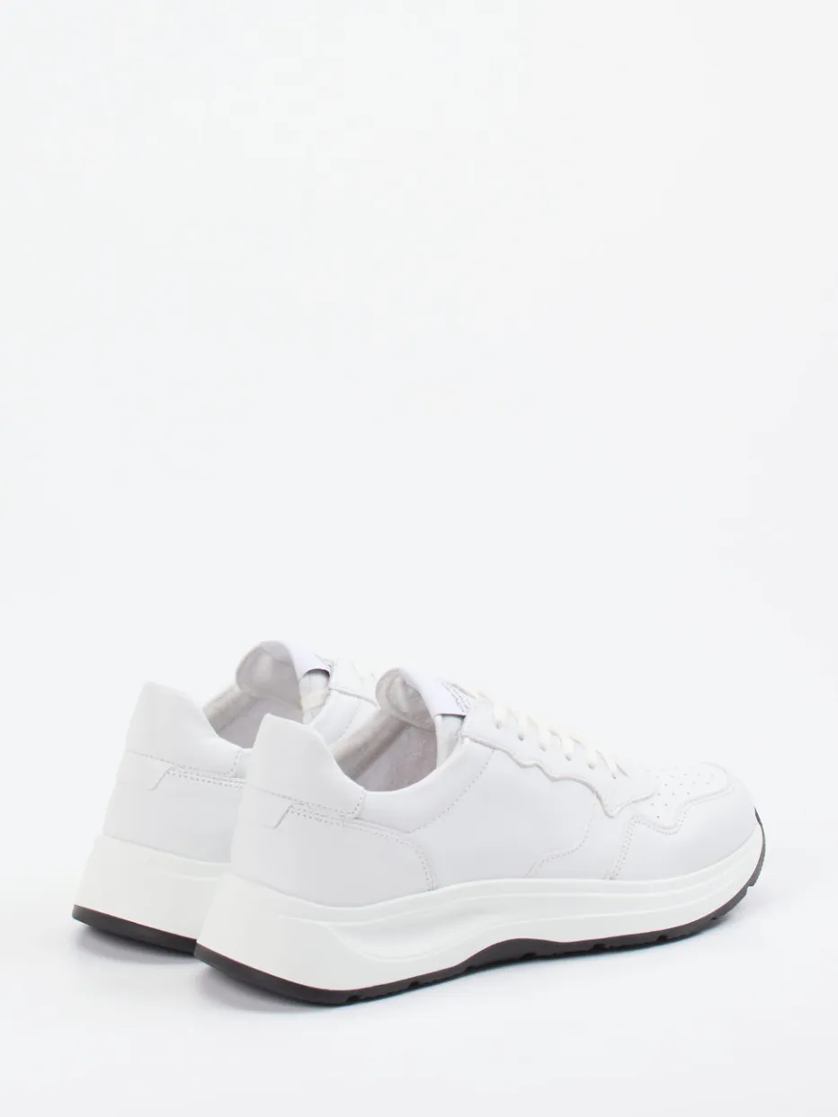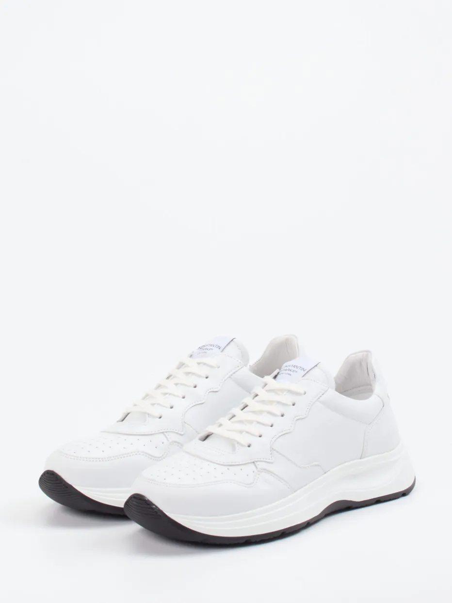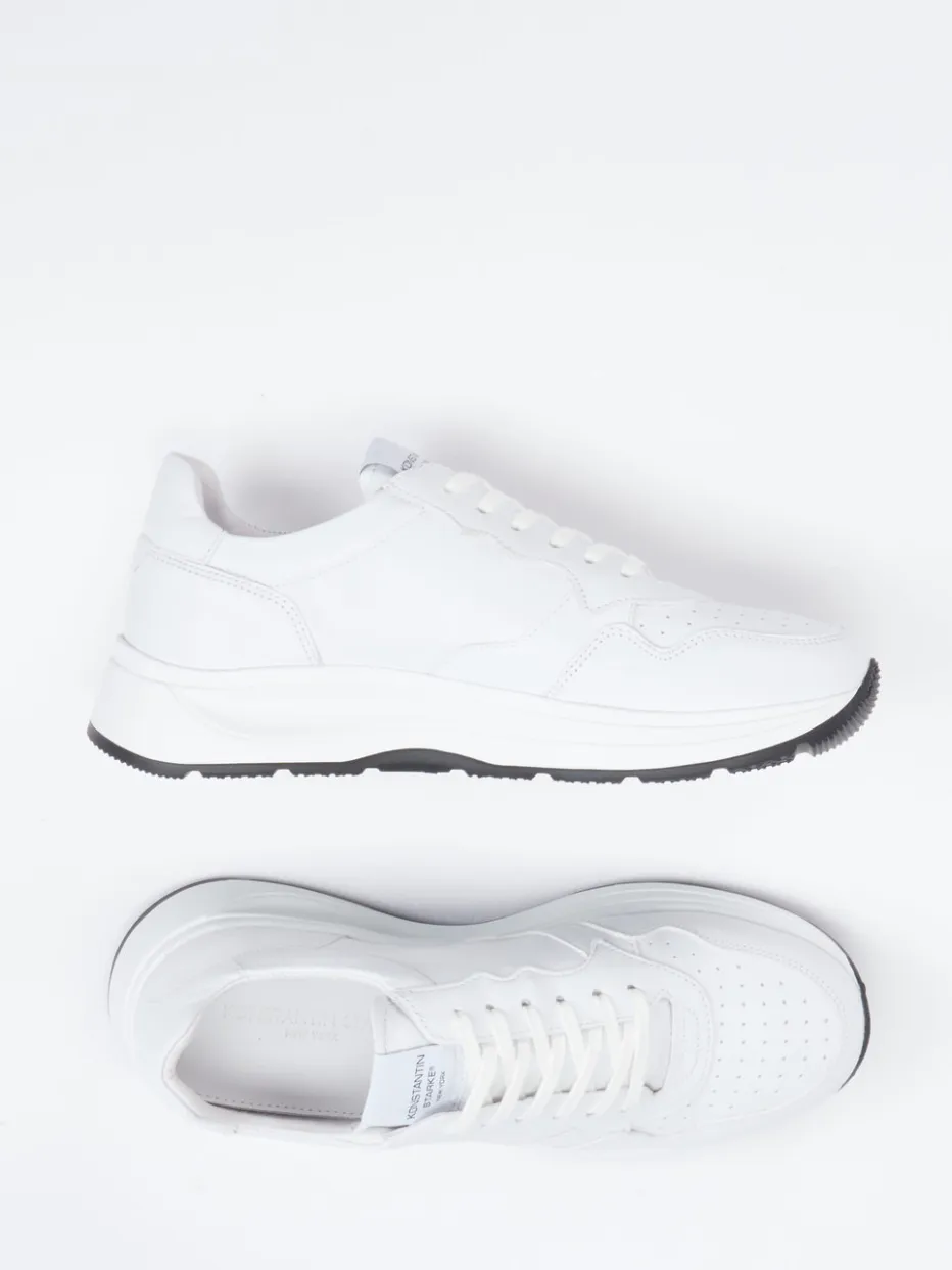 Understatement im Streetwear-Stil.Konstantin Starke interpretiert den klassischen Low-Top Sneaker neu. Für urbane Looks mit komfortabler Basis ist dieses Modell ideal: Gefertigt aus strahlend weißem Kalbleder mit matter Oberfläche und dezenten Perforationen im Vorfußbereich trifft es einen modernen Minimalismus. Die sportlich geformte Gummisohle mit schwarzem Profil unterstützt die Abrollbewegung und sorgt für sicheren Tritt. Innen sorgt ein Textilfutter aus Frottee für atmungsaktiven Komfort, während das gepolsterte Wechselfußbett die Funktionalität unterstreicht. Straffe Linienführung und verstärkte Ferse setzen gestalterische Akzente – passend zu cleanen Businesspants oder entspannten Stoffhosen. Ein hochwertiger Allrounder mit cleanem Look und komfortorientierter Detailverliebtheit.