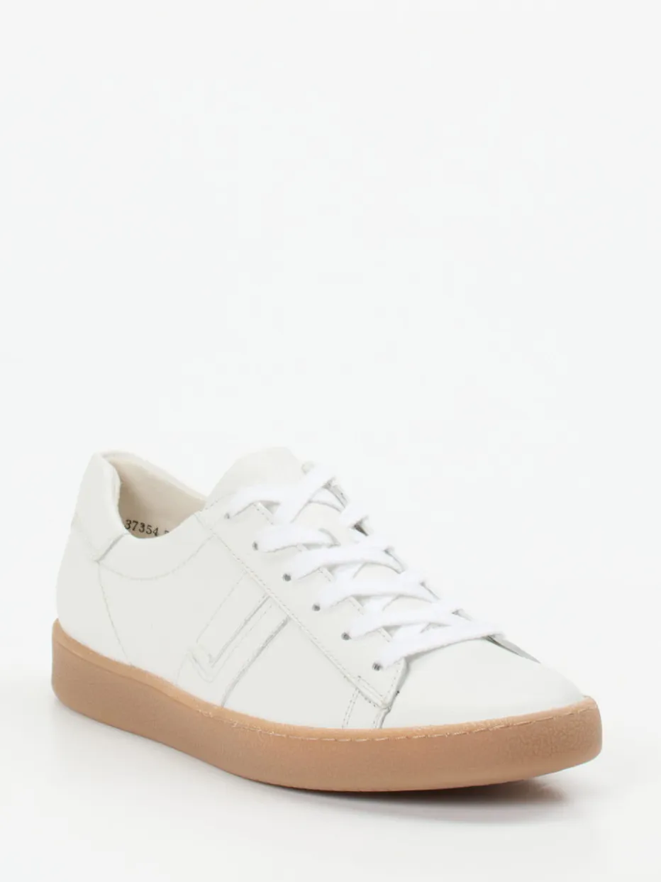 Alltagstauglich mit edlem Minimalismus.Paul Green präsentiert mit diesem Sneaker ein Damenmodell, das Form und Funktion elegant verbindet. Ideal für entspannte Freizeit-Looks überzeugt der weiße Low-Top durch feinnarbiges Kalbleder mit glatter Oberfläche. Tonige Schnürsenkel, ein geprägtes Logo an der Ferse und akzentuell gesetzte Nähte unterstreichen den minimalistischen Anspruch. Die kontrastierende Gummisohle in Hellbraun ist hochflexibel und rundet die klassische Silhouette funktional ab. Das weich gepolsterte Frotteefutter sowie das anatomisch geformte Supersoft-Fußbett gewährleisten angenehmen Tragekomfort – selbst bei längeren Strecken. Stilistisch passt das Modell zu subtilen Quiet-Luxury-Trends und lässt sich vielseitig kombinieren. Ein hochwertiger Basic-Sneaker mit dezenter Retro-Note und markentypischer Qualität.