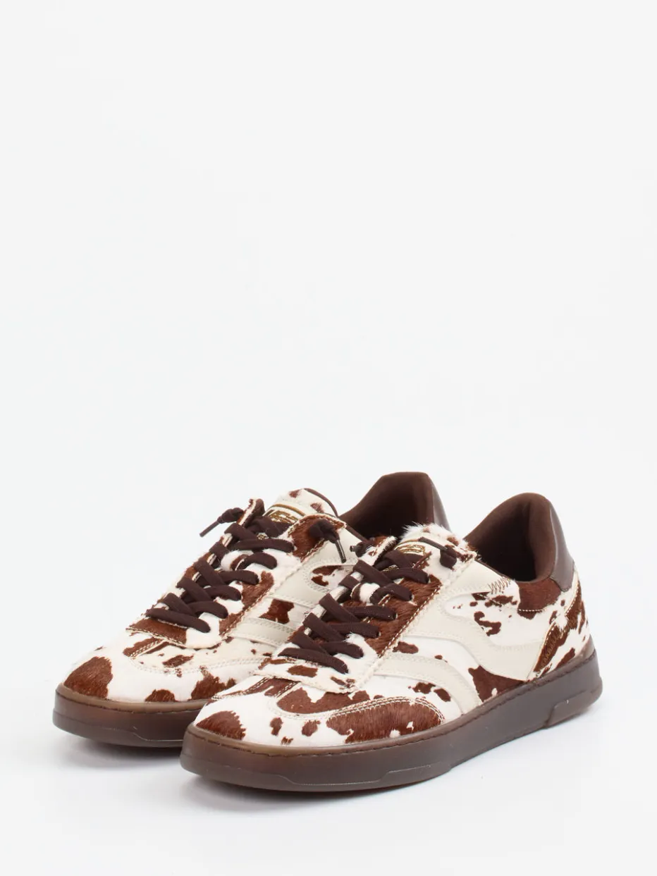 Der Low-Top Sneaker von MRP präsentiert sich als trendstarker Hingucker. Hergestellt aus echtem Kalbshaarleder mit haariger Textur, zeigt er einen auffälligen Kuhflecken-Look in Cremeweiß mit Braun- und Kastanientönen.
