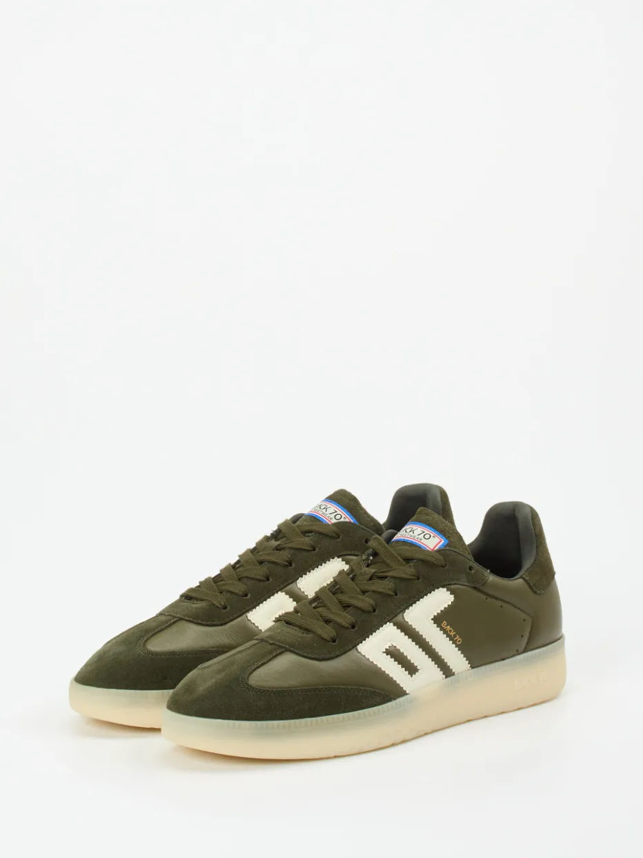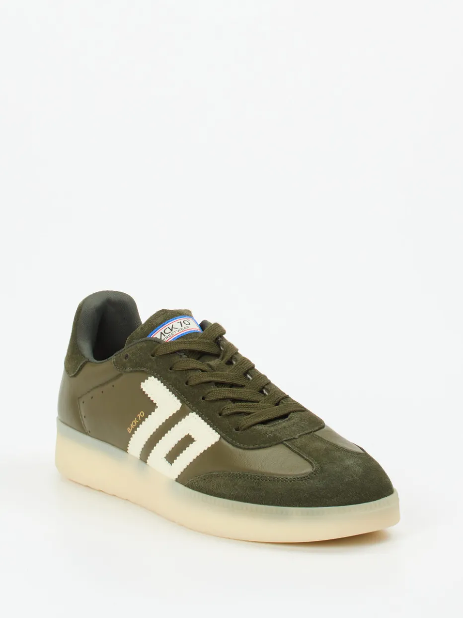 Vintage-Charme neu interpretiert.Back 70 präsentiert mit diesem Retro-Sneaker ein stilvolles Modell für Alltag und Freizeit. Die flache, runde Silhouette in moosgrünem Lammleder mit samtig strukturierten Veloursleder-Akzenten harmoniert ideal mit weißen Glattleder-Overlays. Das markante 70s-Logo auf der Zunge sowie das seitliche Branding stärken die nostalgische Aussagekraft. Atmungsaktives Innenfutter und Wechselfußbett sorgen dabei für modernen Komfort, während die profilierte, leicht transluzente Gummisohle an Streetwear-Styles erinnert. Inspiriert von Retro-Football-Ästhetiken und „Quiet Sportswear“-Trends fügt sich das Modell perfekt in trendorientierte Looks ein. Authentisches Design mit funktionalem Anspruch – typisch Back 70.