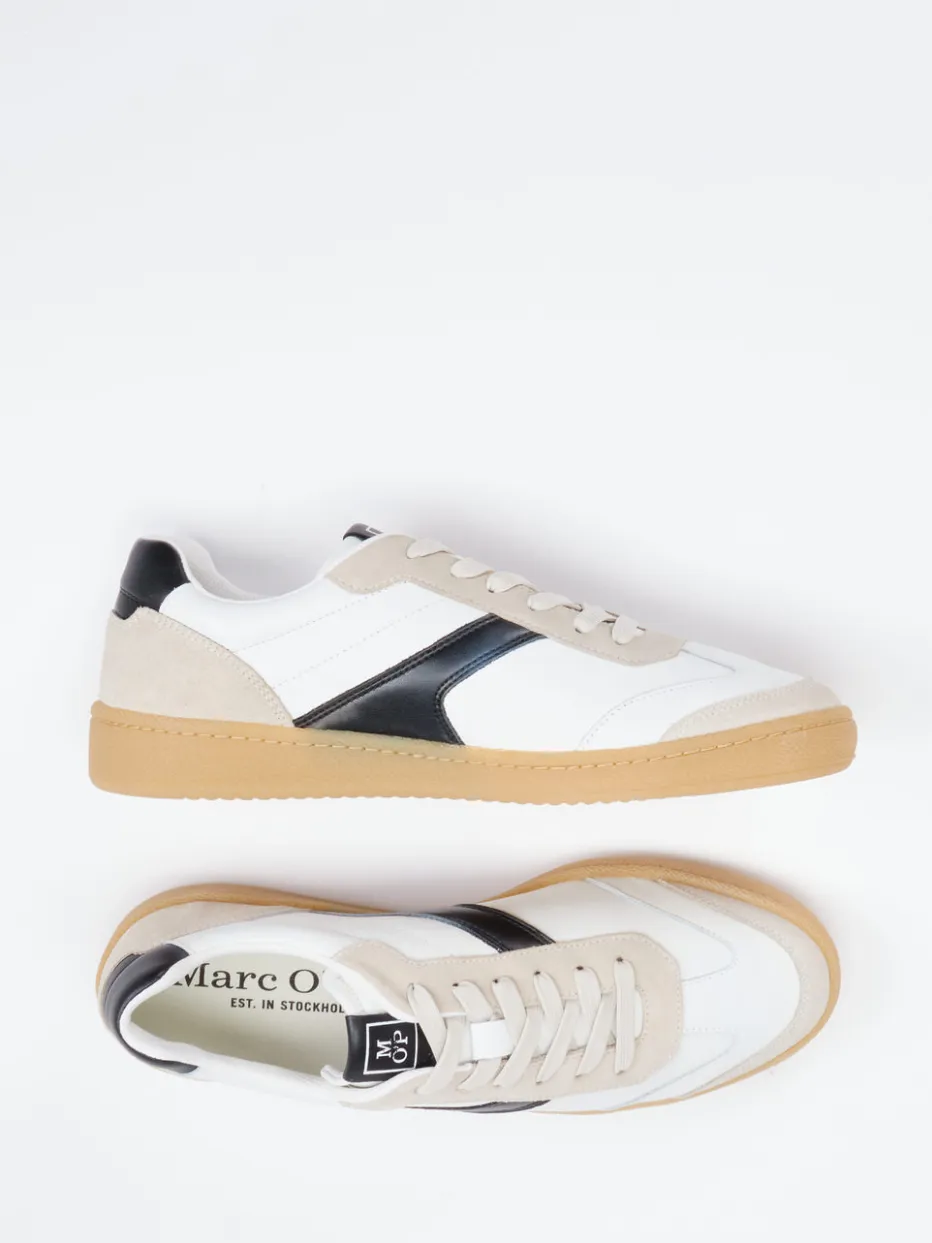Für entspannte Looks mit Anspruch.Marc O’Polo präsentiert einen Low-Top-Sneaker der Kategorie Herren mit klassischer Sneakerform. Ideal für den Alltag bietet dieses Modell mit seinem sportlich-eleganten Design eine hochwertige Basis für viele Outfits. Verarbeitet wurde weißes Lammleder kombiniert mit samtig angeschliffenem Veloursleder in Beige an Spitze, Ferse und Schnürung – akzentuiert von schwarzen Patches und goldfarbenem Logo. Eine geprägte, flexible Gummisohle greift den Retro-Trend stilsicher auf und sorgt gemeinsam mit luftigem Meshfutter und Wechselfußbett für optimalen Komfort. Harmoniert perfekt mit hellen Chinos und Overshirts. Komfortabler Retro-Style, der zeitgemäße Lässigkeit verkörpert.