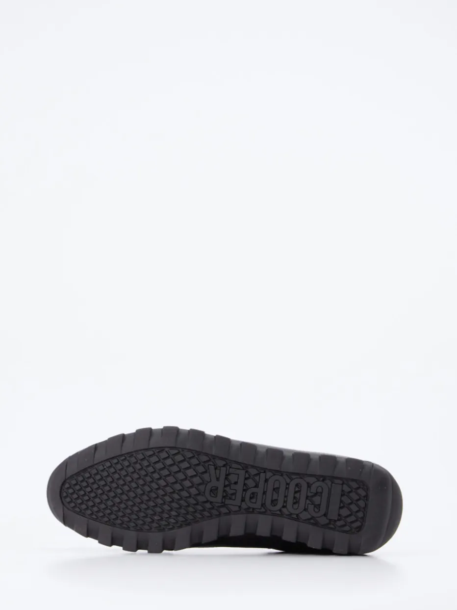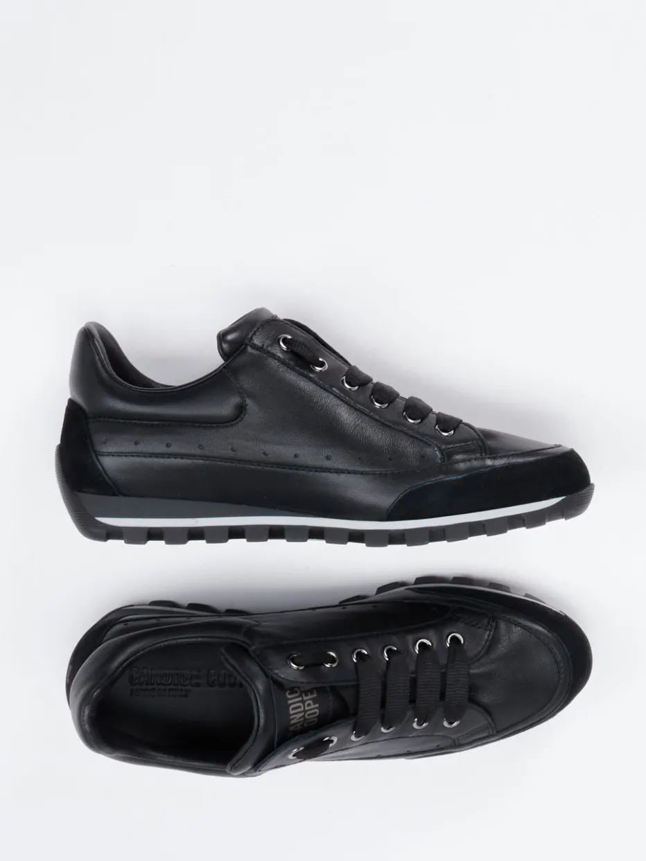 Cleanes Design für urbane Momente.Candice Cooper präsentiert mit diesem Sneaker ein minimalistisches Statement für Alltag und Büro. Ein idealer Begleiter für Tage, an denen Understatement gefragt ist, ohne auf Stil zu verzichten. Gefertigt aus hochwertigem Lammleder mit samtigen Veloursleder-Details, zeigt sich das Modell vollständig in Schwarz mit mattem Finish. Die klassische, schmale Silhouette, die dezenten Ton-in-Ton-Nähte und silberfarbenen Ösen unterstreichen den cleanen Look. Eine markante Gummiprofilsohle mit COOPER-Schriftzug sorgt für urbanen Grip und Komfort. Perfekt zu monochromen Outfits oder minimalistischer Casualwear. Candice Cooper verbindet italienisches Design mit funktionaler Raffinesse.