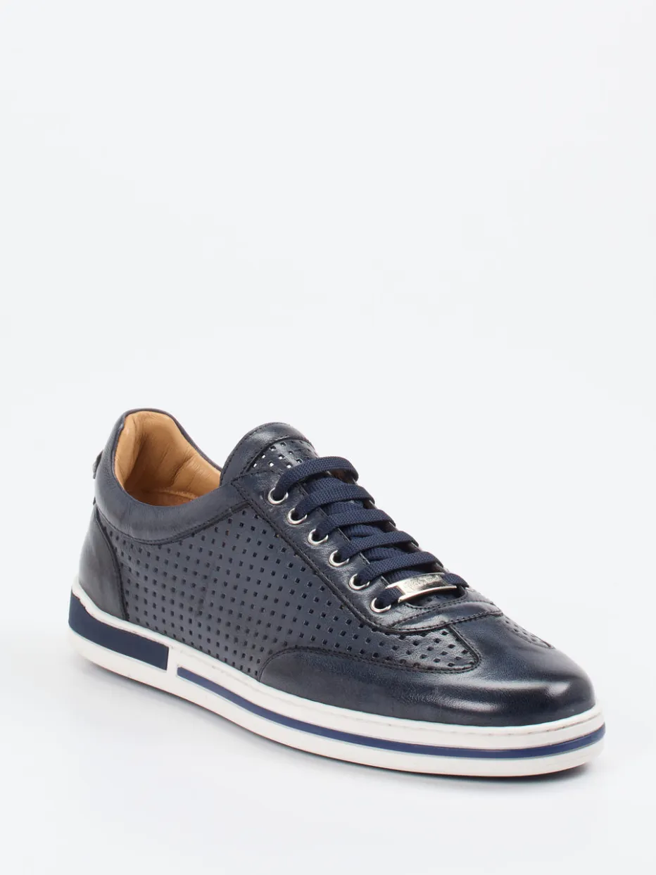 Dieser Herren-Sneaker verbindet hochwertiges italienisches Glattleder mit einer perforierten Oberfläche und smarter Linienführung – funktional und stilistisch überzeugend.