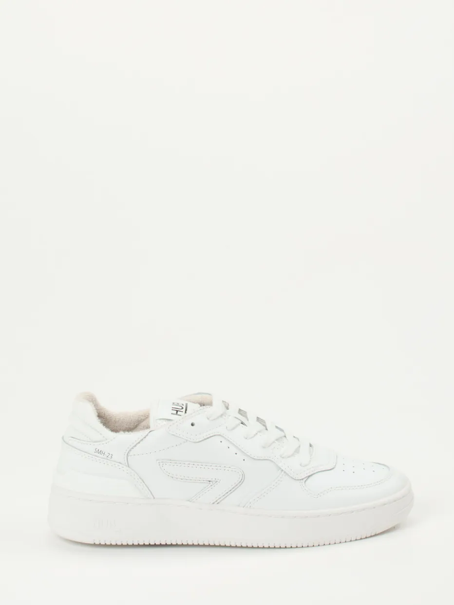 HUB präsentiert einen Sneaker für Damen im Low-Top-Stil, gefertigt aus feinem Leder in strahlendem Weiß.