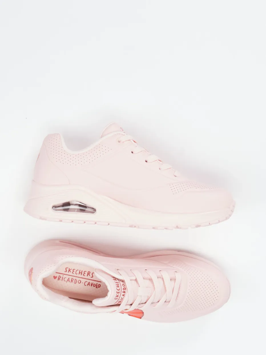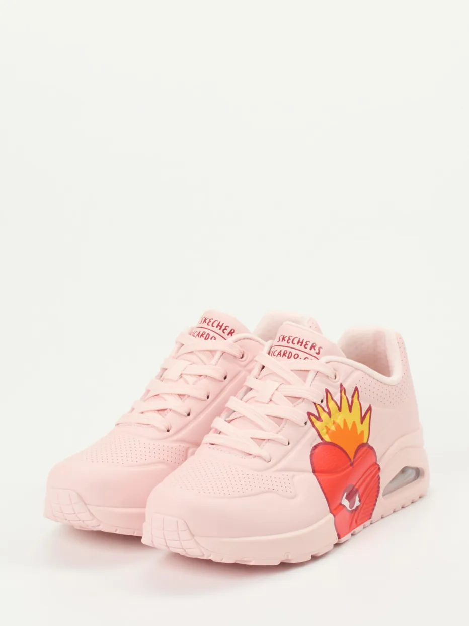 Ob beim City-Bummel oder auf Events – dieser Sneaker vereint Komfort mit pop-artiger Individualität. Glattes Leder trifft auf eine matte Oberfläche und ein auffälliges Herz-Flammen-Motiv des Künstlers Ricardo Cavolo. Das Design auf pastellrosafarbenem Grund erhält durch orange-rote Akzente besondere Tiefe. Luftpolster an der Ferse sowie eine perforierte Zehenbox sorgen für Tragekomfort und Atmungsaktivität. Die tonale Gummisohle unterstützt den sportlich-klassischen Schnitt, während die Streetwear-Ästhetik echte Statement-Qualitäten bietet. Styling-Tipp: Lässig mit pastellfarbenen Socken und Mini-Rucksack kombinieren.
