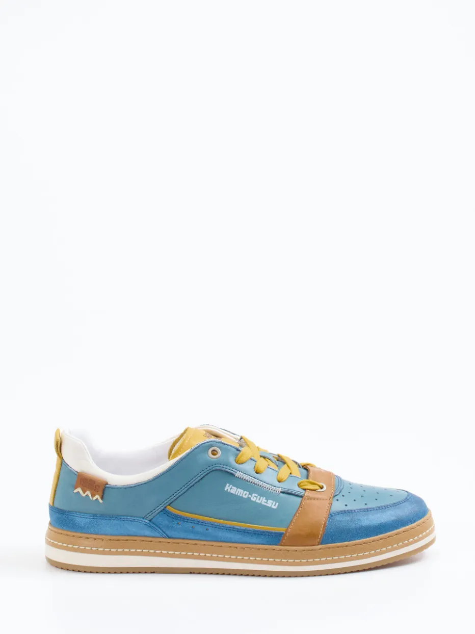 Retro trifft Farbe.Kamo Gutsu präsentiert mit diesem Low-Top-Sneaker ein auffälliges Freizeitschuhmodell für modisch Anspruchsvolle. Ideal für urbane Alltagslooks verbindet der Sneaker glattes und samtig angeschliffenes Veloursleder in Petrolblau mit Einsätzen in Cognacbraun und leuchtendem Gelb. Die klassische flache Silhouette mit Schnürung und Fersenzuglasche sorgt für eine sportiv-lässige Note. Eine profilierte Gummisohle bietet Grip, während ein herausnehmbares, gepolstertes Fußbett und eine perforierte Zehenbox für Komfort und Belüftung stehen. Vom Color-Blocking der SS25 inspiriert, passt er perfekt zu expressiven Streetwear-Outfits. Ein stilvolles Statement mit Komfortfaktor und authentischer Retro-Ästhetik.