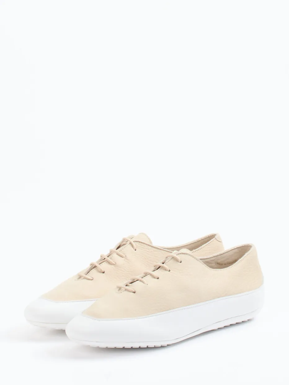 Ideal für warme Tage oder entspannte City-Touren macht das Modell durch sein hochwertiges, genarbtes Leder in sandigem Beigeton auf sich aufmerksam. Die ungefütterte Verarbeitung sorgt für ein angenehm luftiges Tragegefühl. Klar strukturiert mit flacher, abgerundeter Silhouette, Fünfloch-Schnürung und weißem, griffigem Gummirahmen überzeugt der Sneaker durch Funktionalität und optische Ruhe. Der Look passt perfekt zum Trend „Quiet Luxury“ und ergänzt mühelos lässige Naturtöne oder sportive Basics.