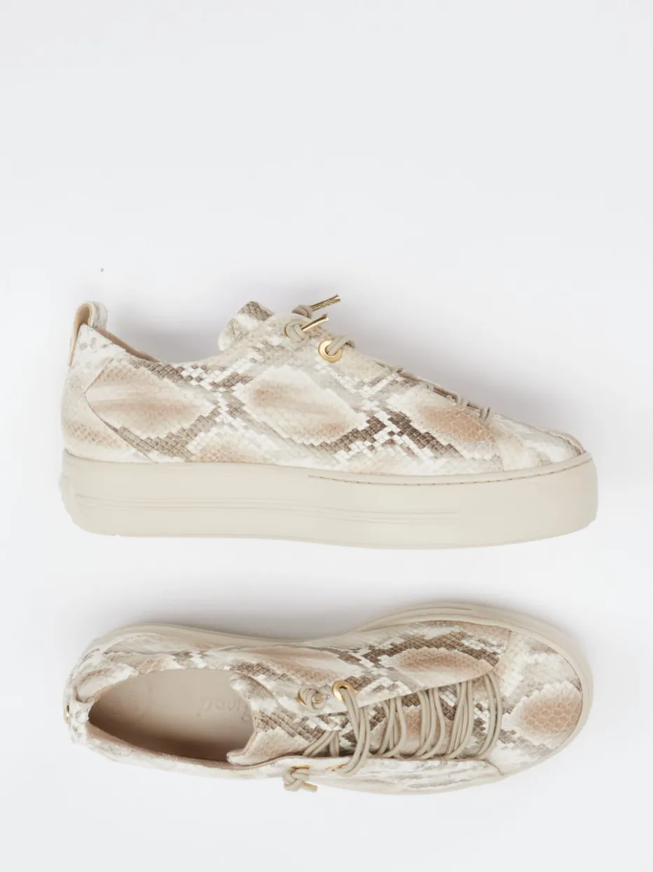Der Plateau-Sneaker von Paul Green kombiniert genarbtes Leder in soften Beigetönen mit einer angesagten Schlangenprägung und goldfarbenen Details für stilbewusste Alltagslooks.
