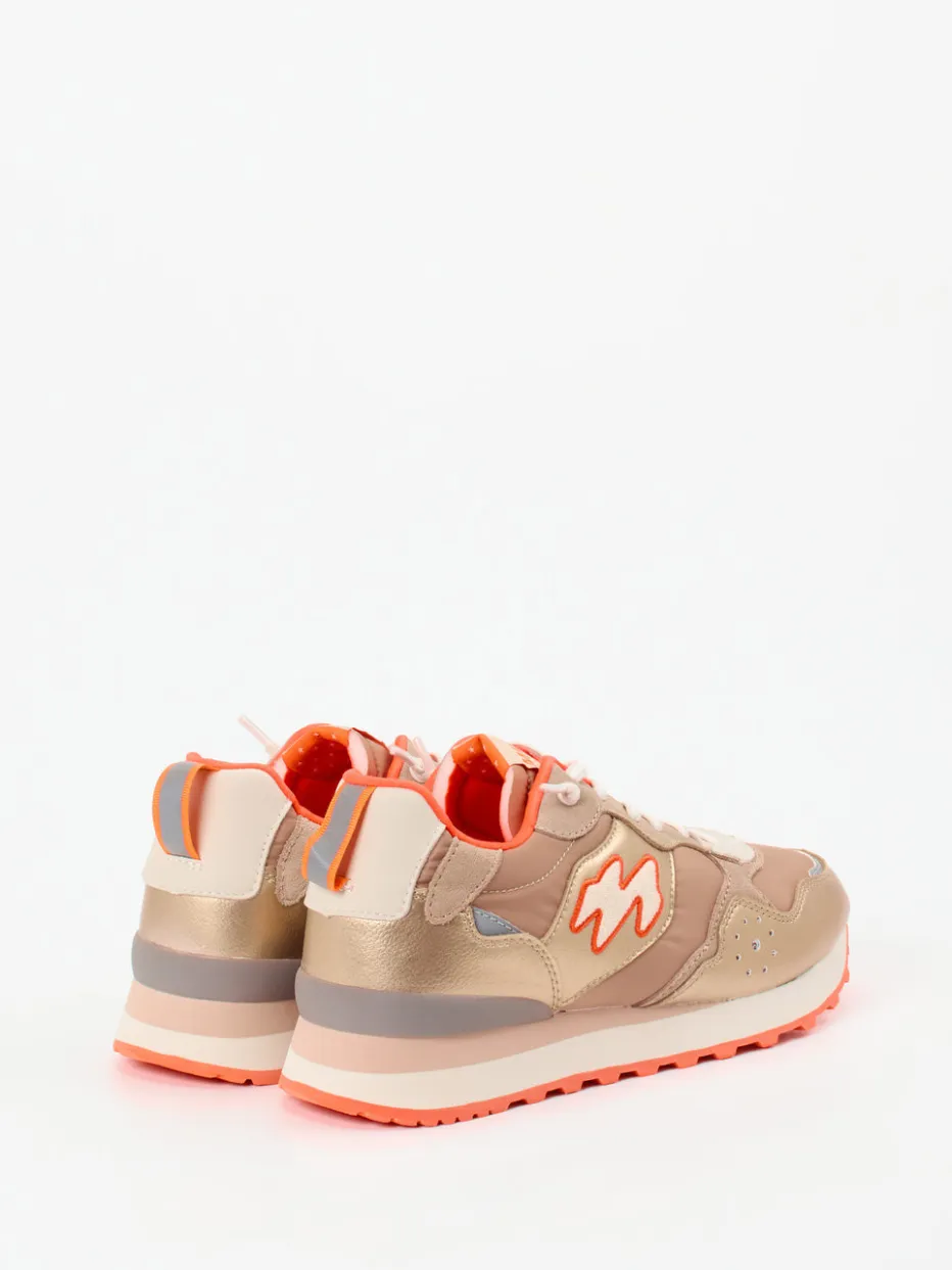 Der trendige Sneaker von MRP kombiniert Metallic-Material in Roségold mit neonfarbigen Akzenten. Komfort und auffälliges Design treffen hier auf Retro-Vibes.