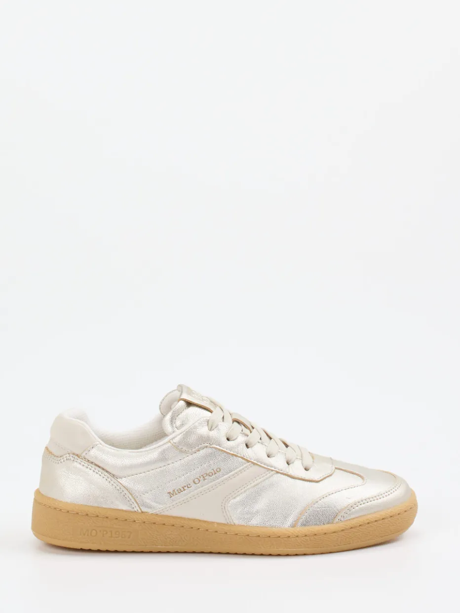 Silber mit Glanzmomenten.Marc O’Polo präsentiert mit diesem Sneaker in Low-Top-Ausführung ein modernes Statement für City und Freizeit. Das silberfarbene Metallicleder mit glänzender Oberfläche sorgt für einen stilvollen Akzent im Streetstyle. Die klassisch flache Form und die markante Gummisohle mit Krepp-Optik sind retro-inspiriert und versprühen angesagten Court-Flair. Eine goldfarbene Logoprägung sowie die Textil-Innenausstattung aus recyceltem PET unterstreichen den Mix aus modischer Strahlkraft und funktionalem Wohlfühlfaktor. Kombinierbar mit Trenchcoats, Leinenhosen oder Metallic-Accessoires für einen urbanen Look. Modernes Design mit nachhaltigem Anspruch – ein Sneaker mit Stil- und Komfortplus.