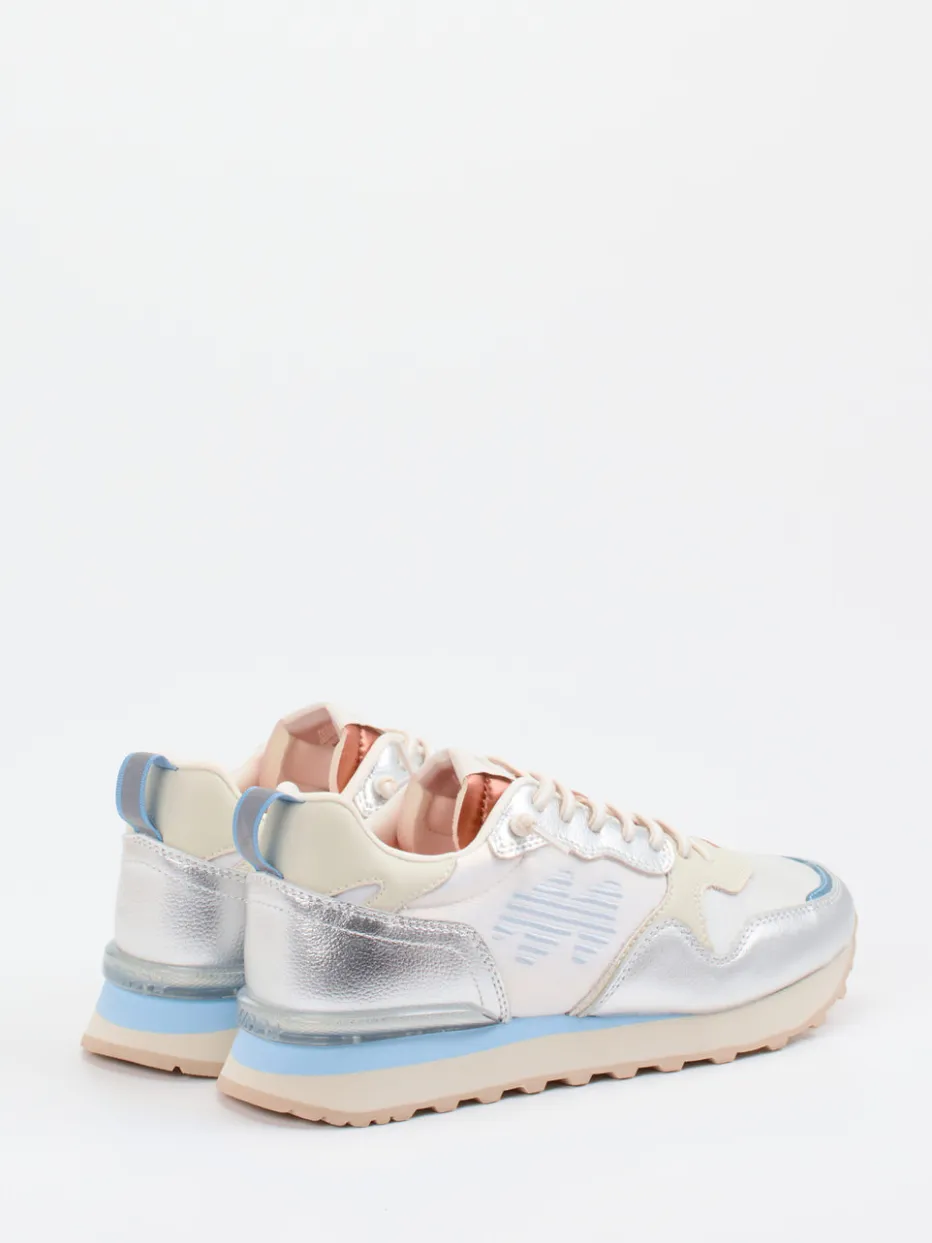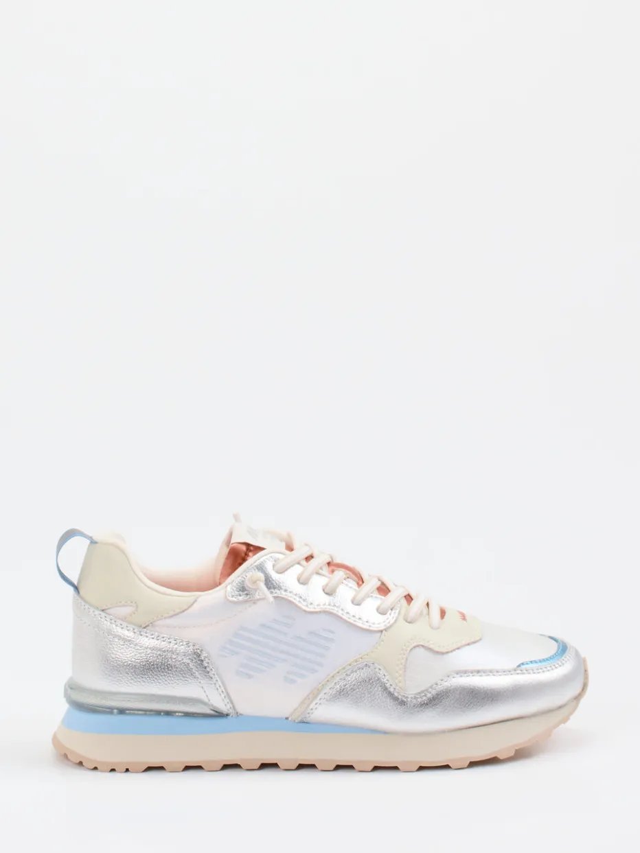 Ideal für urbane Tage mit viel Bewegung: Das Modell kombiniert atmungsaktives Textil mit silberfarbenem Metallicleder, ergänzt durch pastellige Akzente in Apricot und Hellblau. Die profilierte Gummisohle bietet sichere Trittfestigkeit, während reflektierende Details an der Ferse und eine elastische Schnürung moderne Funktionalität einbringen. Der Retro-Look im Y2K-Stil passt perfekt zu Cropped-Jeans oder einem sportlichen Kleid.