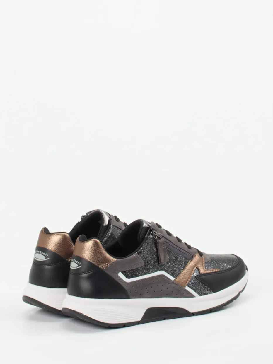 Eindeutig individuell.Gabor Comfort präsentiert mit diesem Damen-Sneaker einen modischen Alltagsbegleiter mit Komfortversprechen. Ideal für den Alltag inszeniert sich der sportlich-voluminöse Sneaker mit auffallenden Metallic-Einsätzen in Bronzegold und einer Basis aus schwarzem Glattleder sowie sportlich perforiertem Velours- und Glitzertextil. Die breite Schnürung in Kombination mit einem seitlichen Reißverschluss ermöglicht ein unkompliziertes An- und Ausziehen. Die gepolsterte Schaftrandkonstruktion, Textilfutter und eine dämpfende Gummisohle sorgen für angenehmes Gehverhalten. Der raffinierte Materialmix und Glitzereffekt machen ihn zum Eyecatcher in der Streetwear-Szene. Typisch Gabor Comfort: Tragefreundlichkeit ohne Stilkompromisse.
