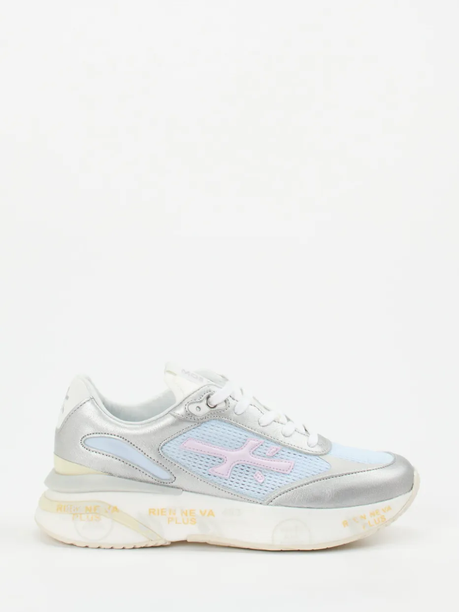 Glanz trifft auf Volumen.Die Marke Premiata setzt mit diesem Damen-Sneaker auf starke Kontraste und klare Formsprache. Ideal für trendbewusste Freizeitmomente oder ausdrucksstarke Streetwear-Looks: Silberfarbenes Metallicleder trifft auf atmungsaktives hellblaues Mesh mit pastellrosa Emblemen – ein Materialmix, der Komfort und Stil vereint. Die sportlich-voluminöse Silhouette wird durch eine auffällig profilierte Gummisohle mit markantem Schriftzug unterstrichen. Gepolsterter Schaftrand und Schnürverschluss sorgen für bequemen Halt. Inspiriert vom Y2K-Revival, spielt das Modell mit aktuellen Metallic- und Chunky-Trends. Kombinierbar mit Crossbody-Bags oder farbigen Sportsocken. Progressive Ästhetik mit italienischer Design-Expertise.